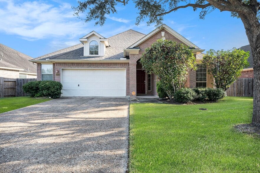 WELCOME HOME to this gorgeous home in the heart of Westover Park! Beautiful open plan with warm designer paint colors, architectural arches, large windows, and French doors to your covered patio. NO CARPET - LVP installed in 2025. The kitchen has rich wood cabinets, granite countertops, tile backsplash, gas range. Master-planned community, Clear Creek schools, quick access to I45 and FM528, quiet neighborhood with parks, walking paths, and of course, a pool! Come enjoy this home!!!