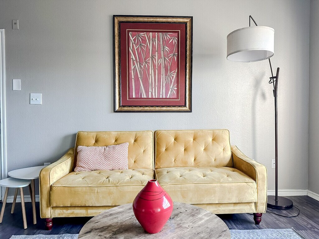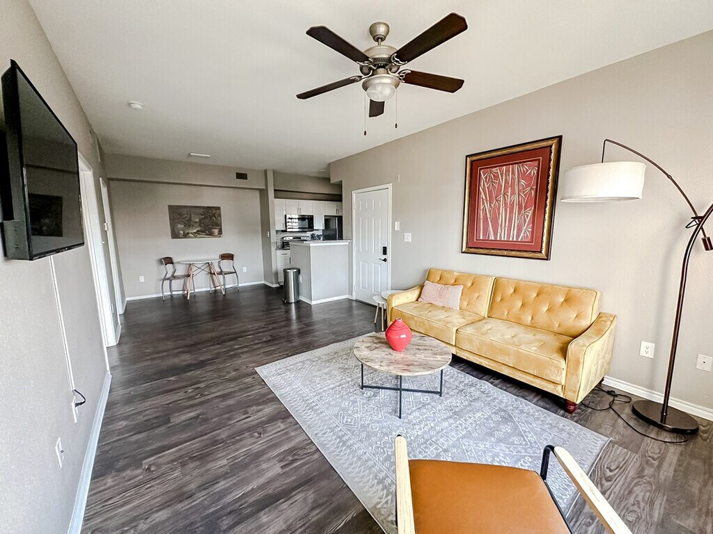 Feel at home in this modern 1-bedroom apartment, designed for a relaxing and hassle-free experience. The apartment is fully furnished and includes a cozy living room, a functional kitchen, a comfortable bedroom, and a clean, well-maintained bathroom. Located in a building without an elevator, this unit offers a practical choice for your stay. Enjoy a comfortable stay with quality amenities and toiletries provided. The living room features a futon for extra sleeping space, making it perfect for accommodating additional guests. Guests have one designated parking spot. Only certified service animals are allowed, with prior approval required. Pet fees are not included in the reservation price, and unauthorized pets will incur a $500 fee. Only dogs are permitted, with a one-pet-per-apartment limit. Guests have access to their unit, the fitness center, and the seasonal pool. The apartment is conveniently located, allowing easy access to check-in information, including a code for your unit and parking details. Smoking of any kind is prohibited, with a $500 fee for violations. Quiet hours are from 10 p.m. to 8 a.m., and parties or large gatherings are not allowed. The apartment does not accept mail or packages, and any lost or damaged belongings are the guest's responsibility. Check-in is at 4:00 p.m. and checkout is at 10:00 a.m., with fees for early or late check-ins/outs. Guests are liable for any damage or theft, with charges up to 120% of the costs incurred. Identity verification is required during the virtual check-in process. The apartment and all amenity areas shall not be used for any unlawful or illegal purpose. Guests shall use the apartment for residential purposes only.