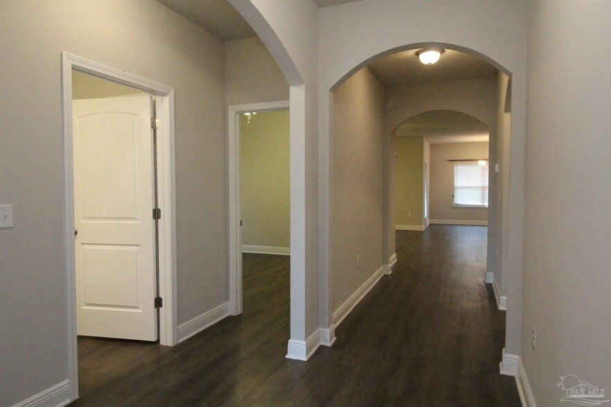 Move-in Special of $250 off the first month's rent. This beautifully maintained 3 bedroom, 2 bathroom brick home is located in the highly desirable Ashley Plantation subdivision in Pace and features an open, thoughtfully designed layout with high ceilings, trey accents, and arched details that add charm and character throughout. Durable wood-look flooring flows seamlessly through every room, offering a clean and cohesive look with no carpet. The kitchen serves as the heart of the home with granite countertops, cream-colored cabinetry, stainless steel appliances including a refrigerator, built-in microwave, flattop stove, and dishwasher and a large island overlooking the spacious living area, perfect for gatherings or everyday comfort. The living room is light-filled with large windows and opens to a covered back patio and fully fenced backyard, ideal for privacy, outdoor relaxation, or entertaining. The primary suite offers a relaxing retreat with a trey ceiling, walk-in closet, and private en-suite bath featuring double vanities, a garden tub, separate shower, and water closet. Two additional bedrooms share a full bathroom with a tub/shower combo, and the interior laundry room includes washer and dryer hookups. This home is pet-friendly with owner approval, with a maximum of two pets allowed and a non-refundable pet fee of $250 per pet (aggressive breeds will not be considered). Residents are required to carry renter liability insurance, which can be added for $11.95/month, or you may opt into our Resident Benefits Package (RBP) for $45/month, which includes liability insurance, HVAC air filter delivery, and on-demand pest control services.