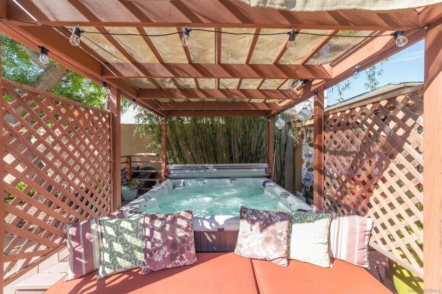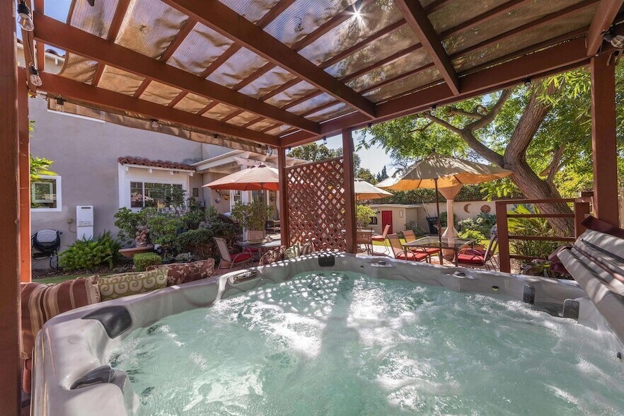This beautiful home has an incredible outdoor living space, lush garden with rock waterfall feature, large Jacuzzi with a covered seating area, outdoor fire pit, BBQ, and plenty of dining and comfy seating to gather with friends and family members. Enjoy the light and airy feeling this home offers with hardwood flooring throughout. The first level has a formal living room complete with a fireplace and piano. There is also a family room/office with a built-in desk, T.V., and a split AC unit. The kitchen has stainless steel appliances, is well-stocked, and opens up to the dining room with french doors leading out to the backyard. There is also a full bath and a laundry room downstairs. The home has 3 bedrooms, all on the second level, and a full bath with a walk-in shower and a spacious bathtub. The primary bedroom has a queen-size bed, a fireplace, a T.V., a small sitting area, french doors leading out to a balcony, and a split AC unit. Bedroom 2 has a full-size bed and a T.V. Bedroom 3 has a twin trundle that can be used as two twin beds or a queen and a T.V. This home sits on a corner lot with plenty of off-street parking, including the driveway behind the garage. Bikes and beach amenities are ready for your use. The home is fully furnished and has everything you will need to completely relax and enjoy your Coronado vacation.