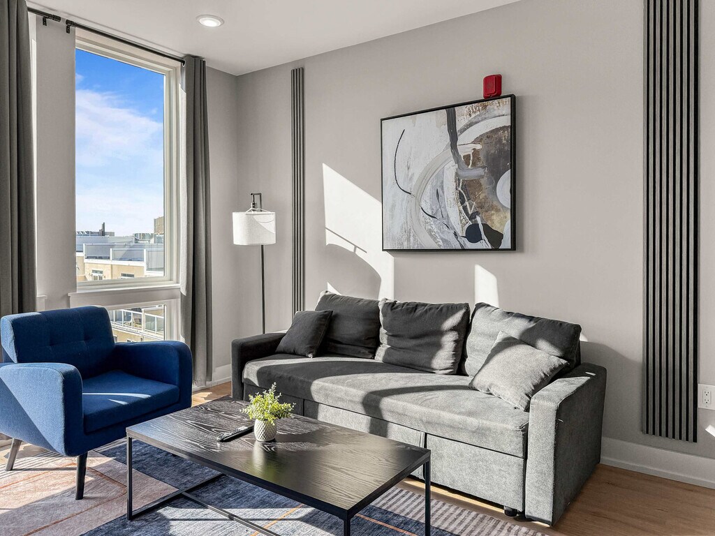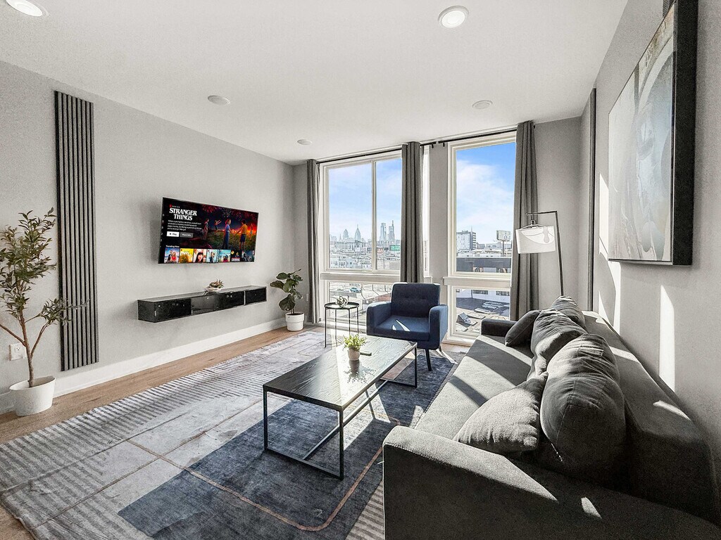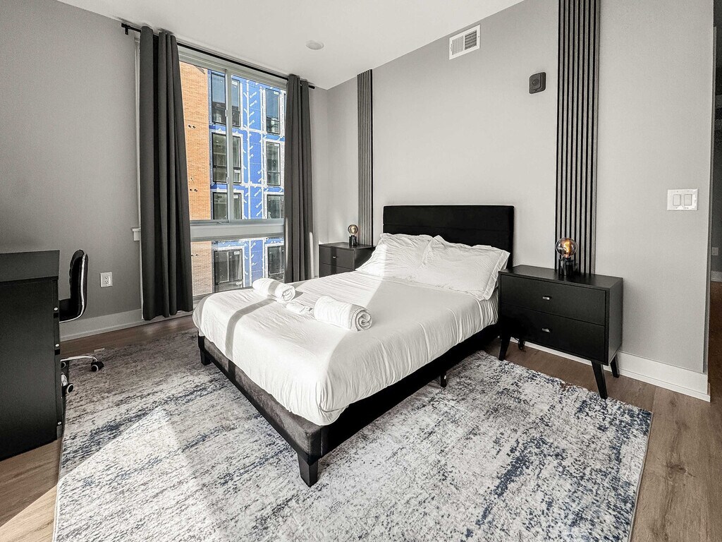 Nestled in a vibrant neighborhood, this charming two-bedroom apartment offers a delightful retreat in the heart of the city. Located just steps away from bustling streets and cultural landmarks, this space is ideal for couples or solo travelers seeking a comfortable stay with easy access to the city's attractions. This inviting 2-bedroom apartment is thoughtfully designed to cater to all your needs for a carefree and enjoyable stay. Relax in the serene ambiance of the first bedroom, furnished with a plush queen bed, and enjoy a restful night’s sleep with high-quality linens, cozy pillows, and ample closet space for your belongings. The second bedroom offers another queen bed, ensuring comfort and relaxation, ideal for additional guests. The living room features a stylish and comfortable sofa bed, seamlessly integrated into the space, perfect for accommodating extra guests. The kitchen is outfitted with state-of-the-art stainless steel appliances, including a refrigerator, oven, stove, microwave, and dishwasher, making cooking and cleanup a breeze. The bathrooms feature a contemporary design with clean lines and high-quality finishes, creating a serene and inviting atmosphere. Pets are allowed depending on size, with a cleaning fee of $25 per night for 1-4 nights, $200 for 5-29 nights, and $300 for 30+ nights. Experience the best of Philadelphia from this stylish urban apartment. Whether you’re visiting for business or leisure, you'll enjoy easy access to the city's attractions. There are surveillance cameras in the hallways for security and a Minut device in the unit for noise level monitoring. No shoes are allowed in the house and guests are requested to do their dishes before leaving. Smoking is not allowed indoors, and if there is evidence of smoking, a $500 fine will be imposed. Equipped with a comfortable desk and chair to ensure you can work for extended periods without discomfort. [SI]