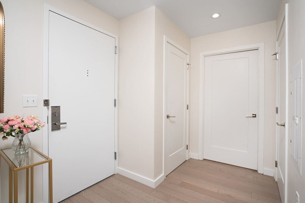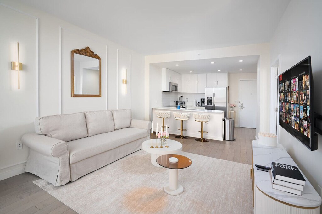 Welcome to this professionally designed, hotel-style apartment in downtown Hoboken, where panoramic views of the Manhattan skyline meet unparalleled comfort. With quick and easy access to NYC and downtown Hoboken, you're perfectly positioned to explore all that this bustling area has to offer. Prepare gourmet meals in the fully equipped kitchen, featuring sleek stainless steel GE appliances, quartz countertops, and everything you need for a chef's touch. Relax in the spacious living area adorned with luxurious furnishings, perfect for unwinding after a day in the city. An additional pet fee is based on the length of stay and may be collected separately. Emotional support animals may incur a pet fee and their presence can be declined from stays. Step outside and enjoy the best of Hoboken, with fine dining, vibrant nightlife, and boutique shopping just moments away. Need to head into Manhattan? A free daily shuttle to the PATH station ensures quick and seamless access to NYC. All properties are smoke-free environments. Smoking of any kind is not permitted within or outside of the suites, including balconies, patios, or common and parking areas. Any sign of smoking is a violation of the stay agreement, which may result in immediate termination and recovery fees beginning at $500. Check-in is at 4 PM and check-out is at 10 AM, with a $75 per hour late fee. There is a $200 penalty for removing smoke detectors and a $300 penalty for lost key fobs. No outside guests are allowed without permission. Only one towel is provided per guest per stay. A valid photo ID is required to complete the booking. A maximum of two pets with a combined weight of 40 lbs is allowed, excluding Pit Bulls, Bull Mastiffs, and similar breeds.