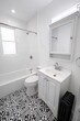 Bright and freshly updated apartment featuring a thoughtful layout and modern finishes throughout. The kitchen offers white cabinetry, ample storage, stone-look countertops, and full-size appliances, creating a clean and functional cooking space. The bathroom is newly renovated with classic subway tile, contemporary fixtures, a vanity with storage, and patterned tile flooring for a polished touch. The home also includes a separate dining area, ideal for everyday meals or entertaining, with ample space for a full dining set and seamless flow into the surrounding living areas. The unit boasts generously sized rooms with excellent natural light, freshly painted walls, and a mix of hardwood and modern plank flooring. High ceilings and updated lighting enhance the open feel, while large windows provide consistent daylight. Additional highlights include updated ceiling fixtures, a ceiling fan, and well-maintained details throughout. Conveniently located close to shopping, ferry service, and public transportation with easy access to Manhattan, this move-in-ready home offers comfort, brightness, and a modern aesthetic.