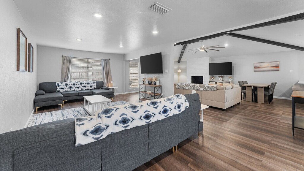 Welcome to your ultimate Corpus Christi retreat! This spacious 4-bedroom, 2-bathroom home is perfect for large families and groups, comfortably sleeping up to 16 guests. Centrally located, you're just a quick drive to Whitecap Beach, top dining spots, shopping, and local attractions. Enjoy two massive living rooms, a fully stocked kitchen, and spacious dining areas, making it easy to feel at home. Designed with you in mind, this home features two massive living rooms with a spacious and open layout, coastal décor, and plush sectional sofas for group gatherings. The fully stocked kitchen boasts stainless steel appliances, ample counter space for meal prep, and a large dining table with additional bar seating. The bedrooms offer comfort with a king-size bed in the primary bedroom, a queen bed in the second bedroom, and two full-over-full bunk beds in both the third and fourth bedrooms, perfect for kids or groups. Enjoy ample parking with a large driveway and two-car garage space. Family-friendly amenities include a kids' table and toys. Nestled in the heart of Corpus Christi, the charming 'The Lakes' neighborhood offers the perfect blend of coastal tranquility and vibrant energy. Enjoy easy access to miles of pristine beaches, nearby parks, and nature reserves for outdoor adventures. Immerse yourself in the local culture and culinary scene with an array of charming cafes, seafood restaurants, and beachside eateries. Family-friendly attractions like the Texas State Aquarium and the USS Lexington Museum are also nearby. Starter supplies are provided, including trash bags, dishwashing pods, toilet paper, shampoo, conditioner, body wash, coffee, creamer, and sugar. These items are intended to get you started, and any additional supplies beyond the starter pack are the guest’s responsibility unless your stay is 14 days or longer, in which case a mid-stay replenishment may be offered. [SI]