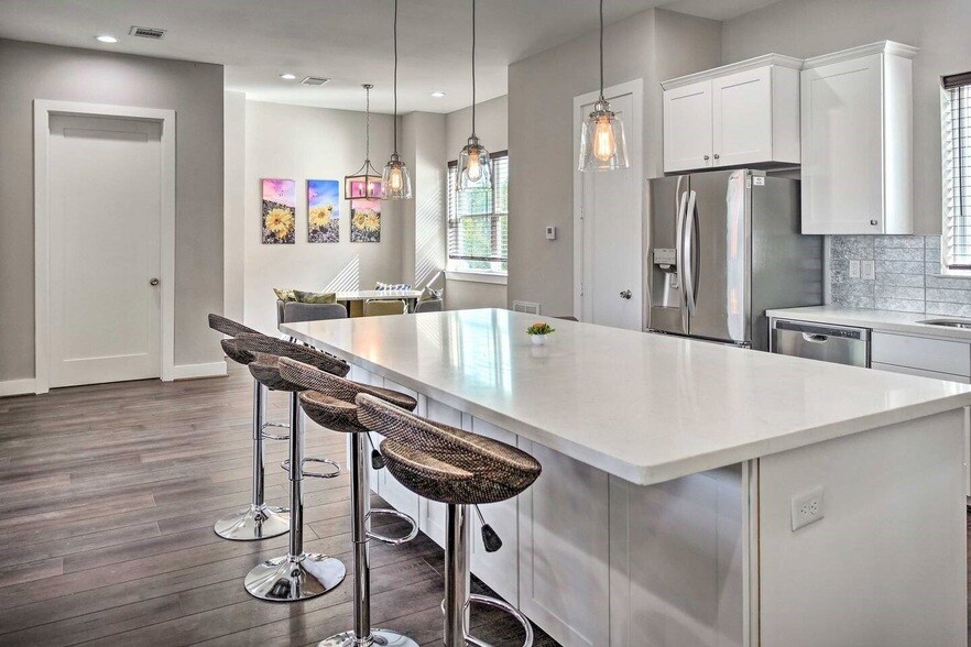 Stunning 3-story Stucco home located minutes away from the Medical Center. This spacious home has a very clean and modern stucco exterior finish. You are greeted with a wood front door that leads you into the tall ceiling foyer with a hanging chandelier. The Kitchen has all the right finishes, including quartz countertops, stainless steel Appliances,subway-style backsplash, and 42" upper cabinets. The island is perfectly placed to overlook the living spaces and also serves as a breakfast bar. The huge family room allows for so much space to entertain. Wood floors greet you throughout the living spaces with excellent placed recessed lighting. The home has a secondary bedroom on the first and third floors. The oversized primary bedroom is also on the third floor and allows you to take in the Houston skyline from your bed. The home is Elevator ready! Area destinations include Medical Center, New HEB, Museum District, Houston Zoo, and so much more. Call today to schedule an appointment.