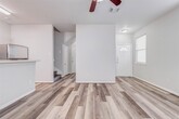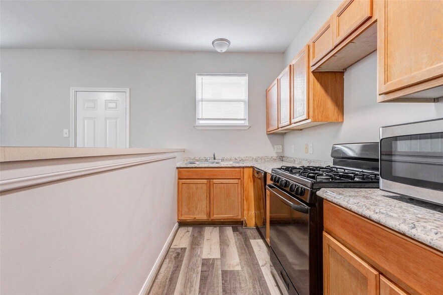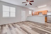 Two-story duplex unit offering a bright and spacious floor plan with four bedrooms and three full bathrooms. Features an open-concept living and dining area with abundant natural light and durable flooring. Well-appointed kitchen with ample cabinetry, generous counter space, and modern fixtures. One bedroom and full bath located on the first floor. Upstairs primary suite includes a private bath and walk-in closet. Secondary bedrooms provide comfortable space and storage. Home includes neutral finishes, ceiling fans, and updated lighting. Attached garage with driveway parking. Fully fenced private backyard with patio area. Well-maintained exterior, roof, and landscaping. Separate entrance for each unit provides added privacy.