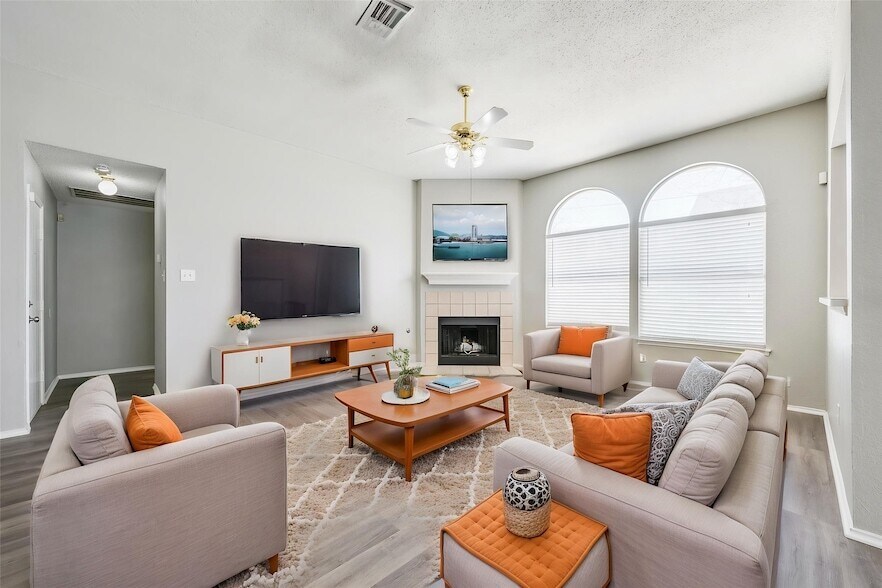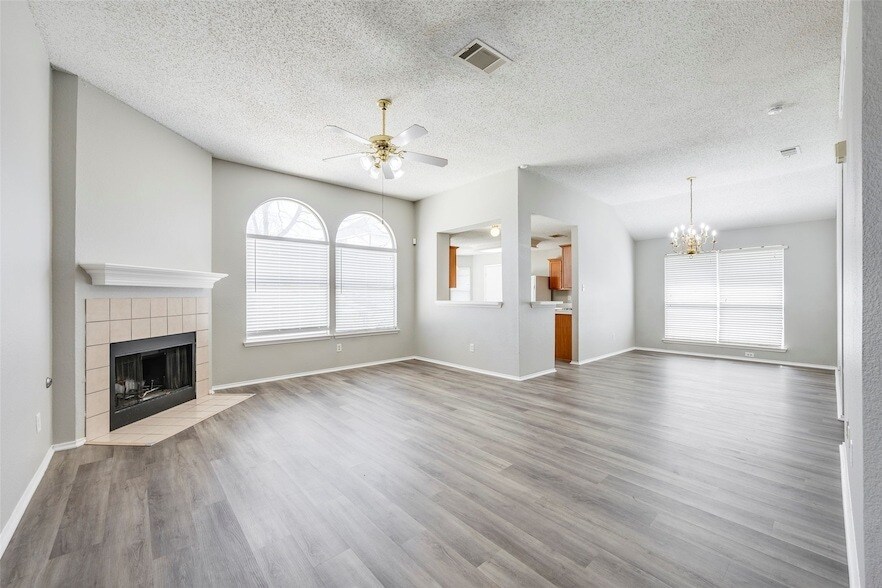 Welcome to this well-maintained 3-bedroom, 2-bathroom rental home located in the highly desirable Mansfield Independent School District. This inviting single-story home features luxury vinyl plank (LVP) flooring throughout, offering a modern look while being durable and easy to maintain. Step inside to a bright and spacious living room with vaulted ceilings, a cozy fireplace, and beautiful arched windows that allow abundant natural light to fill the space. The open layout connects the living room to the dining area, creating a comfortable flow that is perfect for everyday living and entertaining. The kitchen offers ample cabinet storage, generous counter space, and a functional layout, along with a sunny breakfast nook surrounded by windows an ideal spot for casual meals or morning coffee. The primary bedroom features high ceilings and a spacious layout, along with an en-suite bathroom that includes dual sinks, a soaking tub, and a separate shower. Two additional bedrooms provide flexibility for family members, guests, or a home office. Additional highlights include a dedicated utility room, a two-car garage, and plenty of storage space. The backyard provides room to relax or enjoy outdoor activities. Conveniently located near shopping, dining, parks, and major highways, this home combines comfort, functionality, and access to the excellent Mansfield ISD schools, making it a great place to call home.