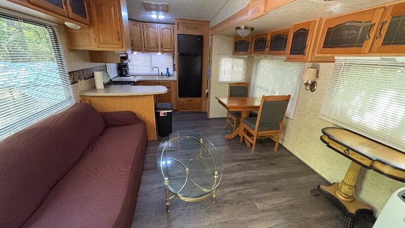 Property Id: 2174788 200 sq ft furnished camper with full sized bed, couch, and dining table. WiFi and utilities (water, sewer, electric, gas) included. Camper is located at a quiet, family-owned RV Park. Camper also includes dishes and pots/pans. There is a free on-site laundry room that is shared with the rest of the park. Tenants MUST have a reliable vehicle as the RV Park is secluded and the nearest store is over 2 miles away.