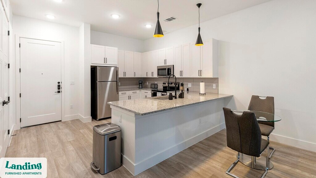 Landing offers flexible lease terms from weeks to months. Please always visit our website or contact us for the latest pricing & availability. Stay longer, save more: 6-Month Minimum base rent: starts at $1980/mo 12-Month Minimum base rent: starts at $1880/mo Landing offers flexible leases across a network of over 35,000 fully-furnished apartments throughout 375+ cities so you can rent on your terms, practically anywhere, and avoid the hassle of paying deposits or application fees. Visit to learn about all the benefits of a Landing membership, see our competitive up-to-date pricing, explore available apartments, take virtual tours, and make reservations online without jumping through traditional rental hoops. Landing's apartments at Railyard are designed for comfortable, easy living, with the ability to stay as long as you like. Experience living with Landing Every apartment is outfitted with all the modern essentials including: custom-designed furnishings, a fully-equipped kitchen with deluxe stainless steel appliances, a gourmet coffee maker, premium linens, Smart TVs, and incredibly fast, reliable internet for working from home. When you live with Landing, you'll enjoy a hassle-free experience with the added benefit of 24/7 access to our dedicated member experience team. Some of the nitty-gritty: a background check and proof of income are required; we're completely smoke-free; bundled utility packages and pricing vary based on length of stay; pet-friendly options available; listed price reflects a 12-month minimum stay.