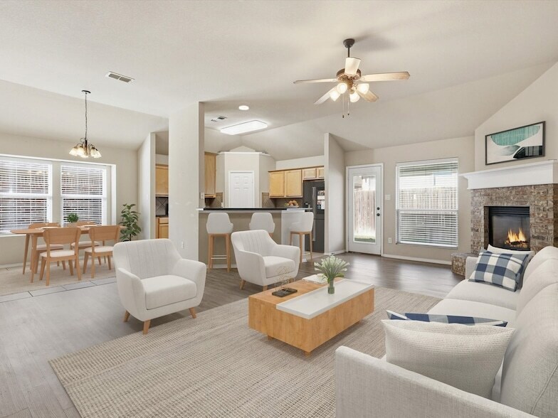 Welcome to this inviting single-story home located in the desirable Eagle Ranch community of Fort Worth. This well-maintained residence offers a bright and open layout with a spacious living area anchored by a cozy gas fireplace, creating a warm and welcoming atmosphere. The kitchen flows easily into the dining space for effortless everyday living, and tile flooring in key areas adds durability while newer carpet in the bedrooms enhances comfort. The private primary suite features a garden tub, separate shower, dual sinks, and a walk-in closet, while two additional bedrooms provide flexibility for guests, or family. For those working from home, the flex space is a great room for an office. It could also be used as a second living space, or playroom...lots of options! Enjoy a covered back patio perfect for morning coffee or relaxing evenings, along with a manageable yard that is easy to maintain. Additional highlights include an attached two-car garage, neutral finishes throughout, and the charm of a quiet, established neighborhood close to shopping, dining, parks, and major roadways. This home offers comfortable living in a fantastic location ready for its next tenant to move in and enjoy.