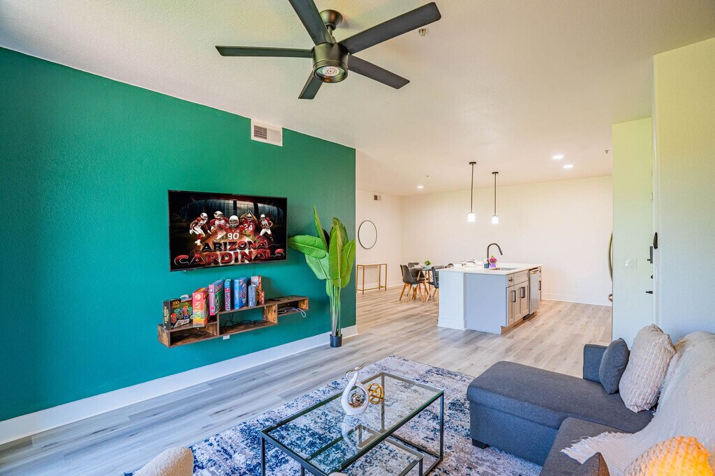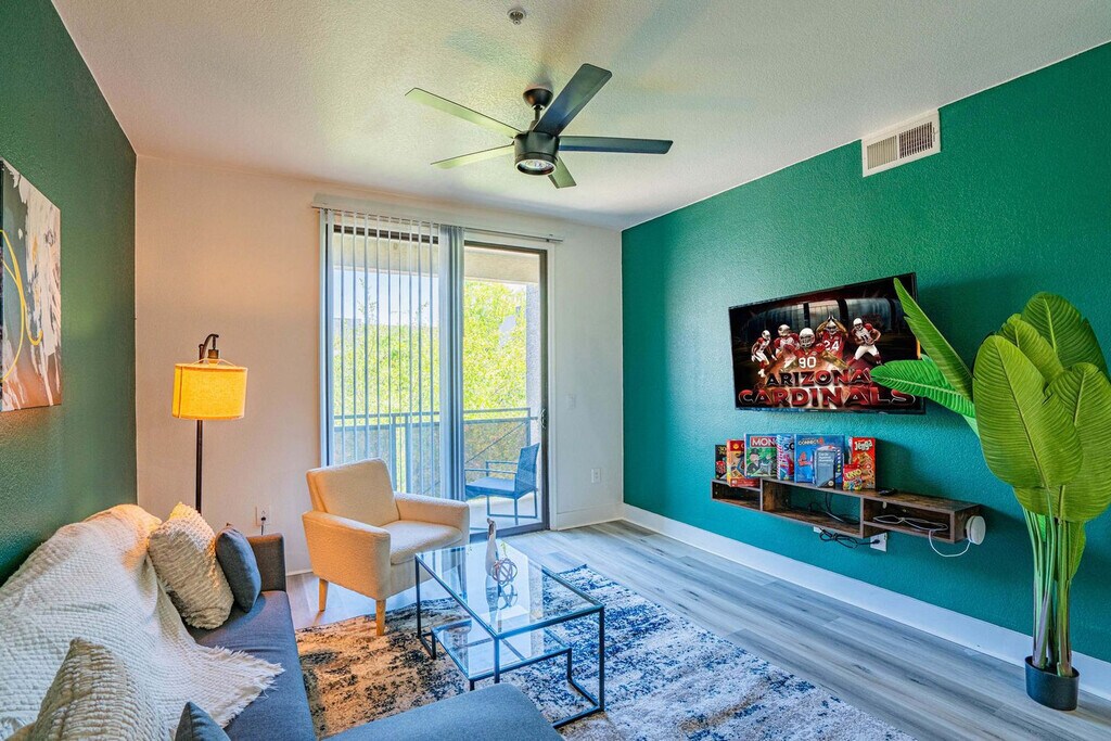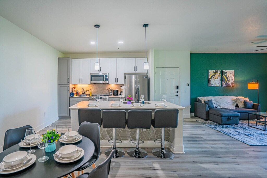 Experience an exclusive stay in this stylish 2-bedroom apartment in prime Glendale, located on the 3rd floor with no elevator access. Perfect for families, friends, or business travelers, this spacious retreat offers upscale comfort, fast Wi-Fi, and a serene vibe. Walk to top dining, shops, and attractions, then unwind in a clean, private space designed for relaxation and ease. Your ideal home away from home awaits. Relax in this 2-bedroom, 2-bathroom unit featuring a socially and environmentally conscious living environment. The innovative open-concept design blends the living and dining areas with the fully equipped kitchen, creating a modern and sleek living experience. The living room is ideal for enjoying the company of friends and family with a stylish interior, a 4K 55" HDR Smart TV, and a variety of games. The kitchen includes a microwave, air fryer, blender, stove, oven, refrigerator/freezer, toaster, coffee maker, and all necessary dining essentials. Parking is available on the premises with instructions provided at check-in. Pets are allowed depending on size or if they are service animals, with an additional cleaning fee of $20 per night per pet. There is a 2-pet maximum and only cats and dogs are allowed. If pets are brought without prior notification, a $500 fee will be charged. Located in prime Glendale, this apartment offers easy access to top dining, shops, and attractions, making it an ideal spot for exploring the area. Guests need to walk upstairs as there is no elevator access. The apartment is on the 3rd floor. Noise monitors are installed to measure noise levels, and tampering with them will incur a fee. Security cameras are located in the hallways for added security. A guest verification process is required, including providing a government-issued ID and possibly undergoing a background check. Pets are allowed with restrictions on certain breeds and a maximum of two pets. A $500 fee applies if pets are brought without prior notification. The apartment includes an office desk and chair in Bedroom 1, providing a comfortable space for work-from-home needs. Fast Wi-Fi is available throughout the apartment.