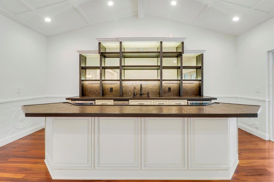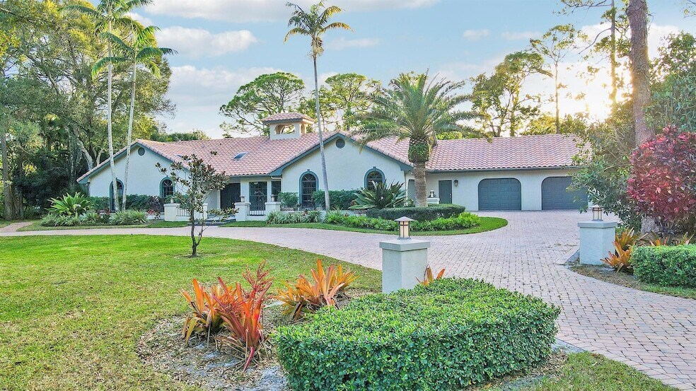 Experience elevated living in one of Wellington's hottest neighborhoods in this stately Mediterranean estate set on a private 1.21-acre corner lot. A circular driveway and lush tropical landscaping offer exceptional space and privacy. Inside, vaulted ceilings and sun-filled Brazilian cherry hardwood floors create an elegant yet inviting atmosphere, complemented by a split-bedroom layout and versatile den ideal for a home office or media room. Designed for luxury and functionality, the property includes two 2-car garages (4 bays total) and a private resort-style backyard with a heated saltwater PebbleTec pool and spa.