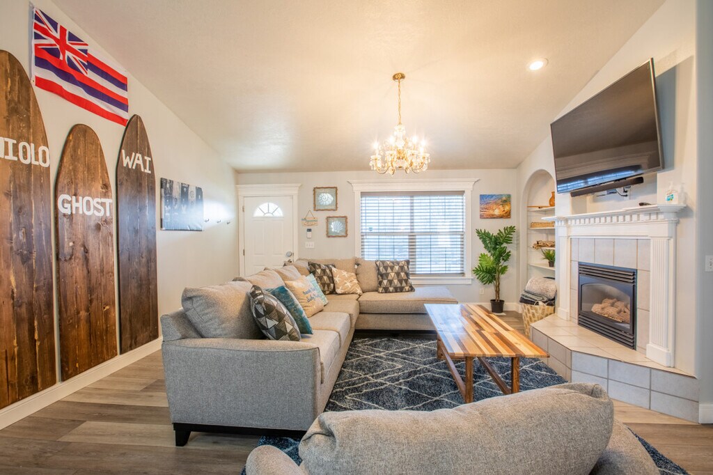 Welcome to Duke Kahanamoku's Surfer Hawaiian Haven, a 4-bedroom, 3-bath home in Pleasant Grove, Utah, infused with the Aloha spirit. Designed for relaxation and unforgettable memories, this spacious and fully remodeled retreat offers a tropical escape. The home features a luxurious master suite with a king-size bed on the main floor, two queen beds, and a bunk bed with twin and full options, perfect for hosting your Ohana. The fully stocked kitchen is a chef’s dream, ideal for crafting culinary delights with a tropical twist. The adjoining dining area and bar seating create a great gathering spot for meals or mai tais. The living room boasts a massive sectional, a premium sound system, and a smart TV with streaming capabilities, perfect for chill movie nights or a surf-inspired playlist. Nestled in a peaceful cul-de-sac with limited traffic and friendly neighbors, this home is your ideal oasis in Utah. Conveniently located, it's a short drive to local destinations such as Utah Valley University, Brigham Young University, Thanksgiving Point, Sundance Ski Resorts, Timpanogos Cave National Monument, and Downtown Salt Lake City. No smoking or vaping is allowed on the premises, with a $200 per day fee for violations. Pets are welcome at the cost of $10 per pet, per day, with additional fees for unauthorized pets and damages. Quiet hours begin at 10:00 PM each night. Early check-in and late check-out requests are subject to availability and fees. Outdoor security cameras may be in use, and maintenance may occur during your stay with prior notice.