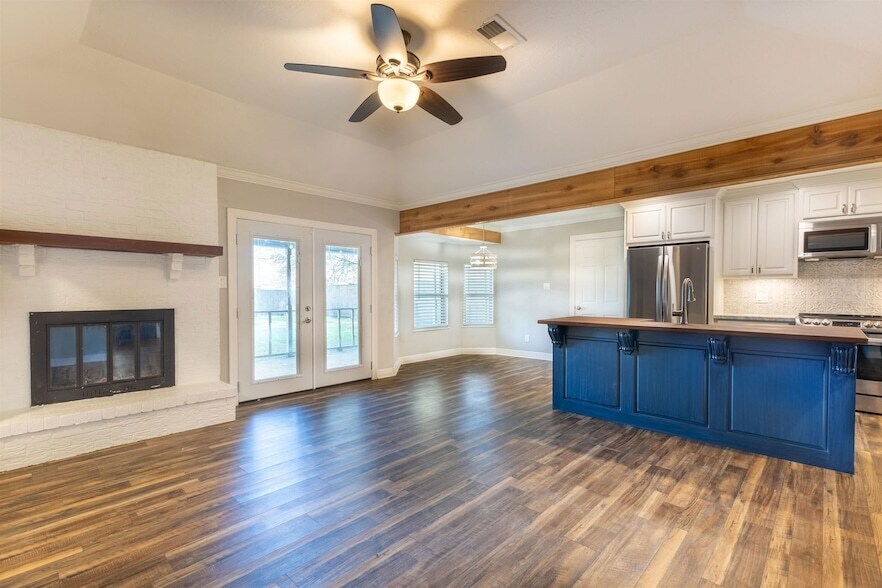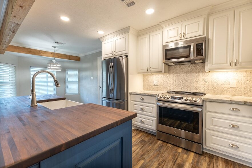 Welcome to your new sanctuary in the heart of LCM! This delightful 3/2 home offers a perfect blend of comfort and functionality, ideal for families or anyone seeking a serene lifestyle. Step inside to discover a thoughtful floor plan that flows seamlessly, featuring a living area bathed in natural light with a fireplace ready to enjoy. The kitchen is a chef's dream centered around a stunning Maplewood butcherblock island. You'll love the ample counter space and modern appliances that make cooking a pleasure. Retreat to the inviting primary Suite, complete with an ensuite bathroom for added convenience. The additional two bedrooms are well-sized and perfect for family, guests, or even a home office. A standout feature of this property is the versatile flex space that has a fireplace also , providing endless possibilities for use as a bedroom, 2nd Living room, playroom or office. Enjoy all of this on a corner lot with beautiful shade trees 2 driveways and a 2 car detached garage !