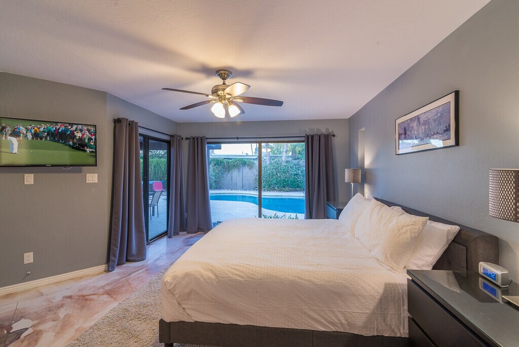 Welcome to Casa De Palms, a beautifully appointed single-story home located in the highly sought-after Kierland area of North Scottsdale. This charming 3-bedroom, 2-bathroom residence offers a seamless blend of comfort and style, with no stairs to navigate. The master bedroom features a king-size bed, a flat-screen TV, and an attached full bath with a walk-in shower. The second and third bedrooms each offer a queen-size bed and flat-screen TVs, ensuring a comfortable stay for all guests. A twin roll-away bed is also available, accommodating up to 8 guests comfortably. For those traveling with little ones, a double high queen air mattress, Pack n’ Play, or high chair can be provided upon request, subject to availability. Casa De Palms boasts ample indoor and outdoor entertaining spaces, including a family room with a huge flat-screen TV and DVD player. The living room seamlessly connects to the dining area, breakfast bar, and fully stocked kitchen, making it perfect for gatherings. An additional sitting area off the living room provides extra space for relaxation. The glass sliding doors lead to a large outdoor covered patio with plenty of seating, a stainless steel BBQ, outdoor pool table, putting/chipping green, "Tiki Toss" game, hot tub, and a heated diving pool. The misting system and ceiling fans help cool the patio during the summer months, creating an ideal setting for a relaxing getaway, golf trip, or family reunion. Extras such as board games and books ensure entertainment for days. A private garage accommodates two cars, with additional parking available on the two-car driveway. The pool can be heated to 85 degrees for an additional charge of $350 per week, while the outdoor heated spa is available at no extra cost. Pets are allowed with prior approval, and a non-refundable pet fee will be added to your booking. All linens, bath and pool towels, and a fully stocked kitchen are provided for your convenience. Situated close to the shopping and dining at Kierland Commons, the Scottsdale Quarter, and the Westin Kierland Resort, Spa & Golf Club, this home is centrally located to all the culture, nightlife, and natural beauty the Valley of the Sun has to offer. Guests are liable for any damages caused to the property. The diving board has been removed from the pool for safety and insurance reasons, but the pool remains deep enough for diving. Pets are allowed with prior approval, and a non-refundable pet fee applies. All linens, bath and pool towels are provided, along with a fully stocked kitchen. Check-in and check-out times are flexible, and a personal property manager is available to assist with any needs during your stay. A separate den area includes a desk and chair, providing a dedicated space to check in with work if needed. Free Wi-Fi is available throughout the home, ensuring a remote work-friendly environment. [SI]