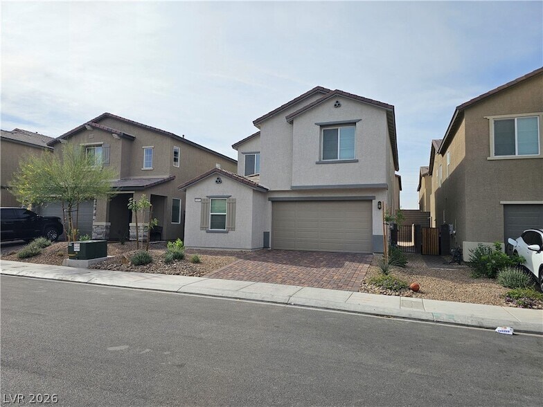 Beautiful and spacious 4-bedroom home with a rare downstairs bedroom and shower bath. The large great room opens to a modern kitchen featuring an oversized island, pantry, stainless steel appliances, and all-tile flooring downstairs. The upstairs primary suite offers a private balcony, huge 13 7 walk-in closet, and separate tub and shower. Additional bedrooms include walk-in closets and a Jack-and-Jill bath. Home includes SOLAR, ceiling fans, extra storage, and a second-floor laundry room with washer and dryer. Desert landscaping in front and a 2-car attached garage. Located in a newer community with convenient access to Nellis, Lake Mead, and Hollywood.