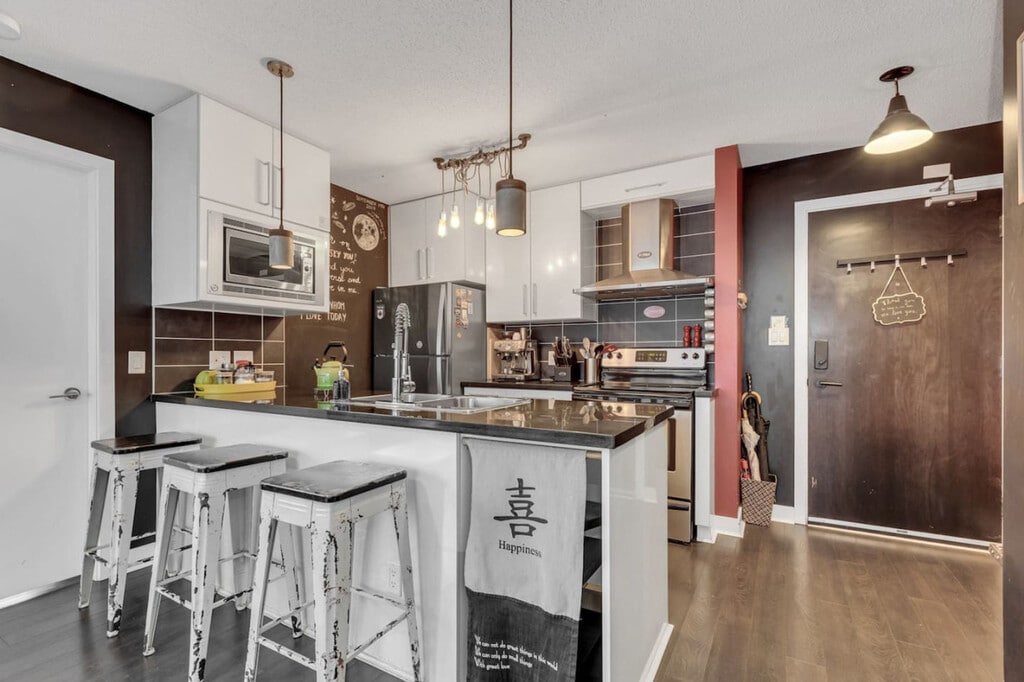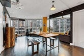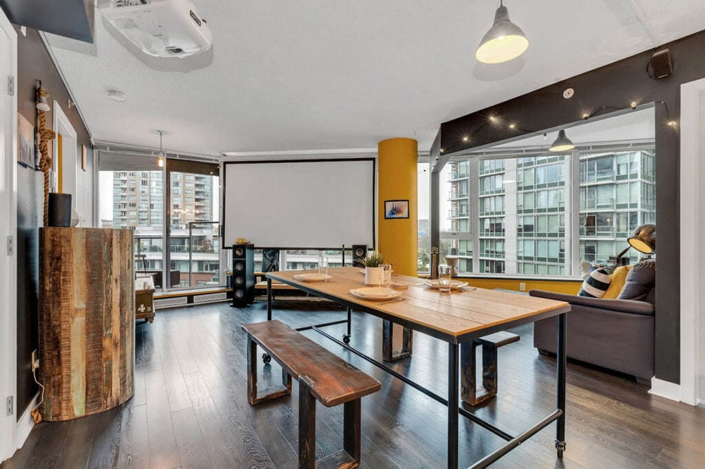 Step into this jewel of a condo in Downtown Vancouver. The standout factor of this distinctive condo is its striking, unique design composition, contrived through rustic textures, dark hardwoods, a youthful essence, and spectacular 180-degree views. The condo is situated in a brilliant location downtown, offering access to all of Vancouver's most desirable spots. The home contains two bedrooms, a full kitchen, a lovely dining area, a living space, an office, and two bathrooms with a shared shower. The space within the home is denoted by a design composition that is trendy, rustic, and truly unique, as seen throughout the furnishings, wall decor, and accouterments. This essence is further achieved with usable longboards, rustic metals, and pops of color throughout the space. Spectacular 180-degree views encompass the surroundings of the condo. The bedrooms follow suit, with creative color scheming evident throughout the bedrooms. Functional built-in speakers are present in every facet of the home so guests can enjoy surround sound music. The condo also boasts a home theatre system, with a drop-down projector screen to watch TV and movies in full size. The space is designed thoughtfully and carefully, boasting an effective layout with the bedrooms on either side of a spacious living area that contains the dining table, living room, and full-size kitchen. Guests will also have access to a pool and a gym offered within the building's amenities. This is the Central Vancouver neighborhood, close in proximity to the Stadium District. This area is bustling with life and excitement, with the Cineplex theatre to enjoy movies, as well as Rogers Arena and BC Place to see concerts and live events. Along these streets are fantastic pubs and restaurants that tourists are sure to enjoy. Downtown Vancouver is surrounded by the seawall, a beautiful pedestrian path that encompasses all of downtown, offering the most spectacular views of Vancouver. Getting around Downtown Vancouver is simple and effective, with bus routes that run up and down the main streets in the area such as Pacific Boulevard and Abbott Street. The Canada Line metro station is nearby in Yaletown, which takes pedestrians all around Vancouver and Greater Vancouver. Rideshare services such as Uber and Lyft are abundant in the area. The trash disposal is in the lobby of the building. Important House Rules: No parties and no large gatherings. Only one pet is allowed. [SI]