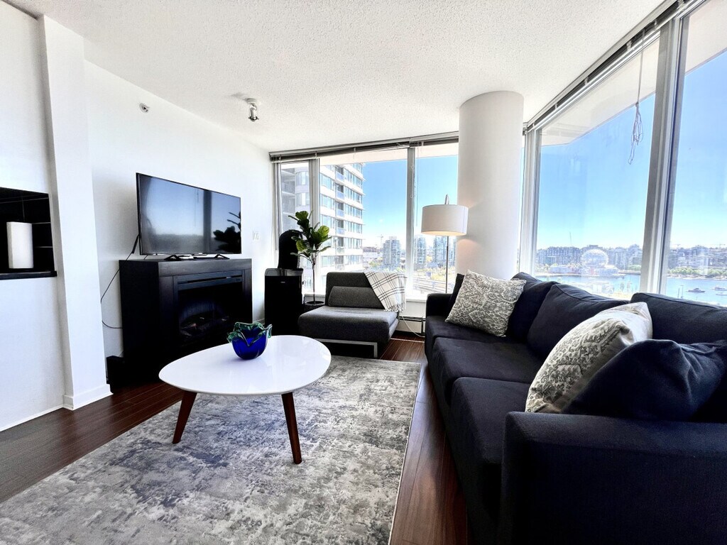 Stunning water views from every room await you in this spacious 1050 sqft 4-bedroom, 2-bathroom condo located in the heart of Downtown Vancouver. Feel at home as you enjoy the comfort of a king-size bed in the first bedroom, a queen bed in the second, a double bed in the third, and a single bed in the fourth. The living room also features a sofa bed, providing ample space for relaxation. Cook in your gourmet kitchen and enjoy spending quality time with your loved ones in your home away from home. Parking is included with your stay. [SI]