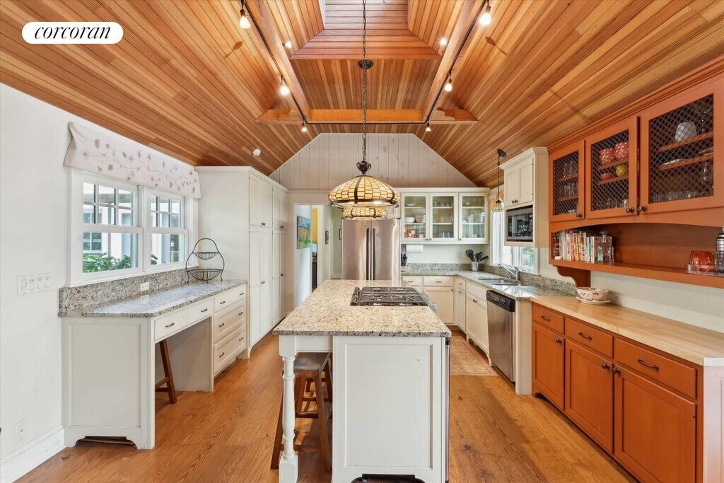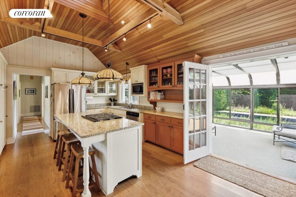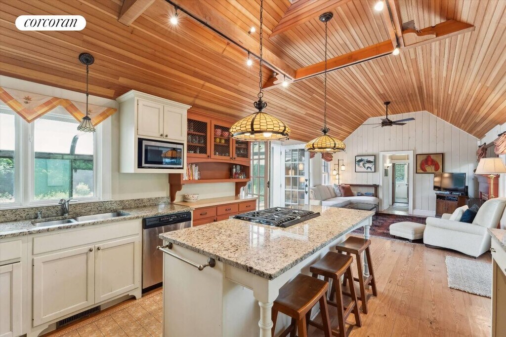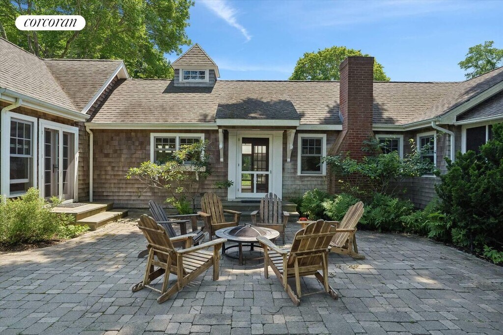 On a quiet lane in Quiogue, this 5 BR / 4 BR is the ideal summer retreat. Inside is an open kitchen, living room with fireplace, glassed-in sunroom, office with daybed, generous dining room, and four bedrooms including a master suite with a private screened-in porch. Outside there are beautiful gardens, wide lawns, a heated gunite pool, large screened in porch, and a pool/guest cottage with queen bed and bath. Basement level has ping-pong and kayaks ready for use at the nearby bay access point. Very close to the newly rebuilt Westhampton Beach Main Street and everything the village has to offer. [[Rental Registration # RP241549]]