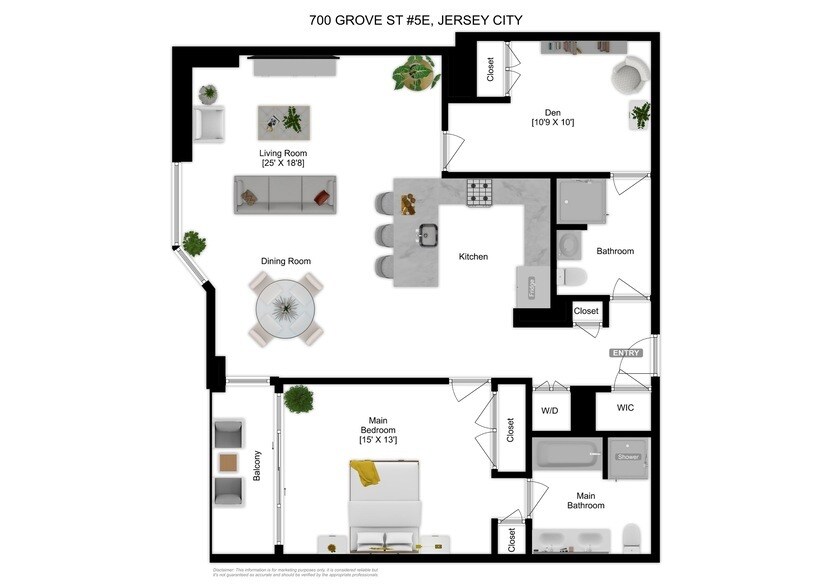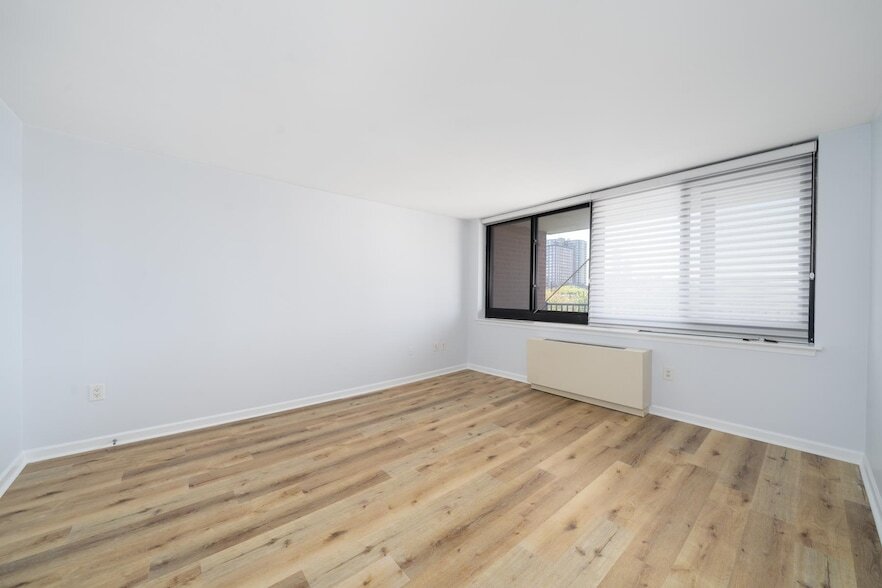 Sun drenched west facing spacious open living / dining area 2BR 2BA (1BR + den) with newly renovated flooring throughout, 1296 SqFt at highly desirable 700 Grove a steel and concrete construction. Perfect entertaining with a Gourmet open kitchen featuring granite counters, breakfast bar, slate tile flooring and stainless steel appliances. The spacious master suite offers plenty of storage and connects to an en-suite bathroom featuring large soaking tub, separate shower and marble double vanity. Den can be used as a second bedroom or office space. Modern guest bathroom. Convenience of an in home washer dryer. One indoor garage Parking space included. Rent includes heat, cold/hot water, cooking gas, cable TV and high speed internet. Building amenities include large gym, 24hr doorman residents lounge, landscaped courtyard BBQ grills and shuttle to Hoboken PATH. Available Jan 1st (Pictures from previous occupancy)