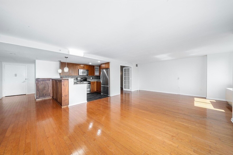 Spacious south facing 2 bedrooms (2nd bedroom is a den can be used as bedroom, office), 2 full baths home. Expansive living/dining area with hardwood flooring throughout. Open kitchen with granite counters, full stainless-steel appliances. Primary bedroom can accommodate a king bed and has custom-built ins walk in closet. Home includes upgraded built in closets throughout - plenty of storage. Primary bath has soaking tub and separate shower stall. Rent includes heat/hot water, basic cable, internet, cooking gas, use of amenities and one indoor parking spot. Gym, residents lounge, upper/lower courtyards with charcoal bbq grills and shuttle to the Hoboken PATH. Close to Newport, parks, restaurants, shops, Holland Tunnel, US 1&9, Rte 78 and NJ Turnpike. Available Feb 1. Small pets considered with pet fee