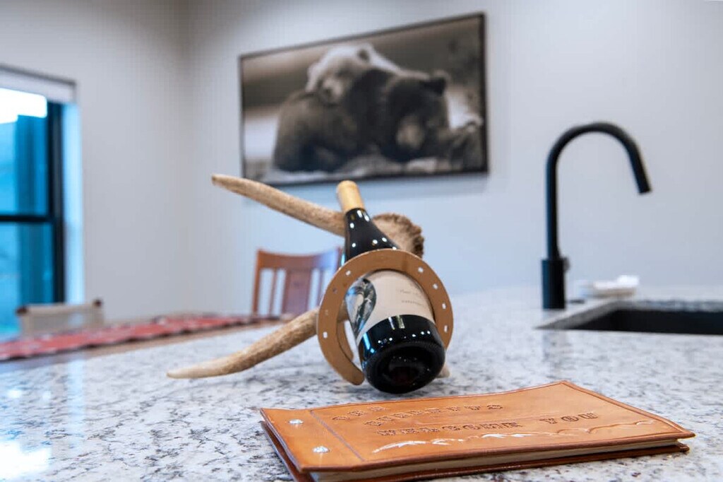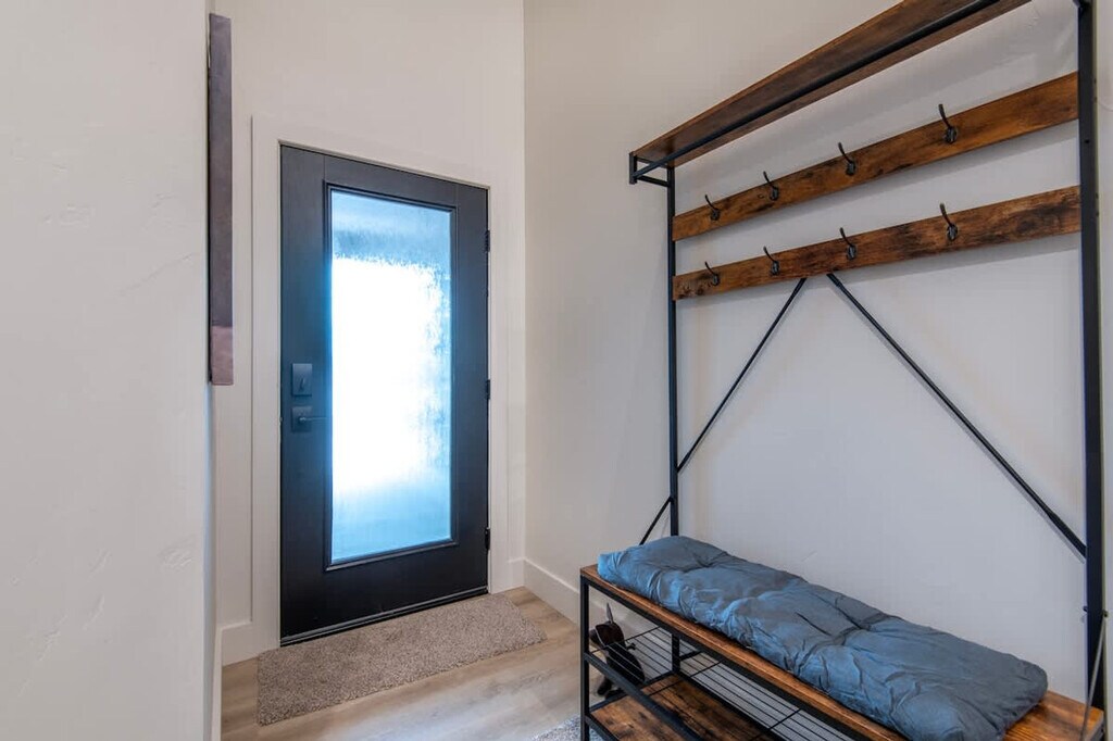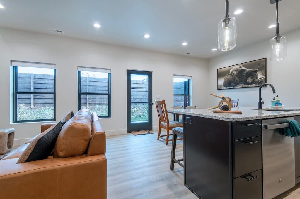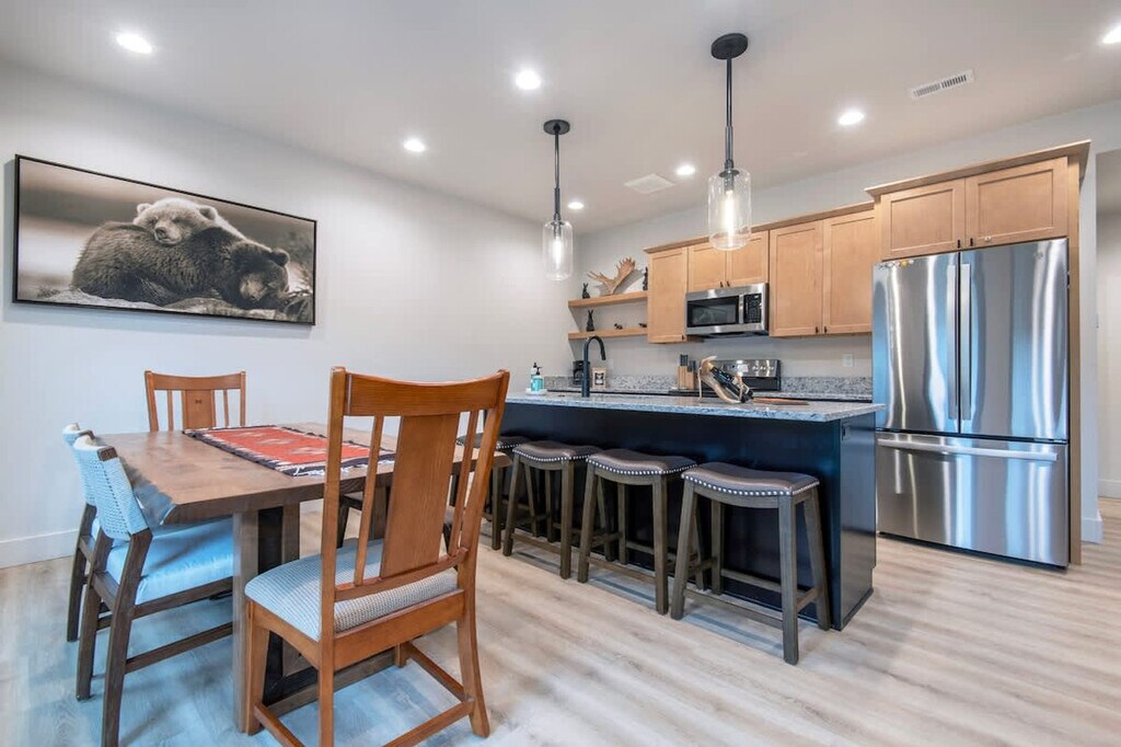 Nestled at the base of the Teton Mountain Range, this inviting townhome offers a warm retreat with charming bear-inspired details. Whether you're here to explore the stunning national parks or simply to relax and recharge, this delightful home is your perfect haven. The townhome features a modern design with rustic touches inspired by the wildlife and natural beauty of the Tetons, ensuring you feel at home from the moment you step inside. Step into this brand-new townhome and feel instantly at home in its inviting, cozy atmosphere. The main level boasts an open-concept kitchen and living space, perfect for gathering, with quartz countertops, a spacious island, and all the tools needed to cook up a feast after a day of adventure. Relax on the plush sofa as the electric fireplace warms the room, and enjoy board games or a movie night on the large Smart TV. Upstairs, all three bedrooms offer added privacy. The primary bedroom features a luxurious king-size bed, a private en-suite bathroom, and a dedicated workspace with a desk and computer monitor, perfect for remote work or catching up on emails. The queen bedroom offers a cozy retreat, while the third bedroom includes two twin beds, ideal for kids or friends traveling together. Additionally, there is a Level 2 EV charger in the garage for guest use. The townhome includes a large 2-car garage with plenty of room for vehicles, gear, and outdoor equipment. Enjoy the comfort of air conditioning year-round. A welcome gift of a complimentary bottle of wine is provided upon check-in. The central location of this townhome makes it the perfect base camp for outdoor enthusiasts and families alike. Enjoy summer activities such as hiking on serene trails, paddleboarding and kayaking on the Teton River, fly fishing in legendary rivers, and biking on nationally renowned trails. In winter, experience the best powder skiing and snowboarding at Grand Targhee Resort and Jackson Hole Mountain Resort, or enjoy snowshoeing and cross-country skiing in Teton Valley. The townhome is minutes from Driggs for dining, groceries, and local shops, and close to Grand Targhee for both summer and winter activities. Grand Teton National Park is a 53-minute drive, and Yellowstone National Park's South Entrance is just over two hours away. Guests are expected to treat the home as if it were their own and be respectful of the rules, neighbors, and local community. Quiet hours are from 9 pm to 8 am. No events, parties, or large gatherings are allowed. Smoking or vaping in the home or on the decks is prohibited, and an additional charge will be applied if any butts are found on the property. Exterior lights should be turned off at night to preserve the dark skies. A maximum of two licensed vehicles is allowed in the driveway and garages. Snow machines, dirt bikes, or ATVs are not permitted in the subdivision or at the rental property. Candles or incense should not be burned in the home, and fireworks are not allowed on the premises. All main entry doors should be locked when not occupied. Fines will apply for violations, including but not limited to smoking in the house or garage, failure to follow house rules, and failure to vacate at check-out time, with a minimum $500 fine for smoking/vaping/marijuana in the house or garage, violation of house rules, posted signs, laws, or failure to vacate at check-out time. The primary bedroom includes a dedicated workspace with a desk and computer monitor, perfect for remote work or catching up on emails after a day of adventure. A laptop computer is not included.