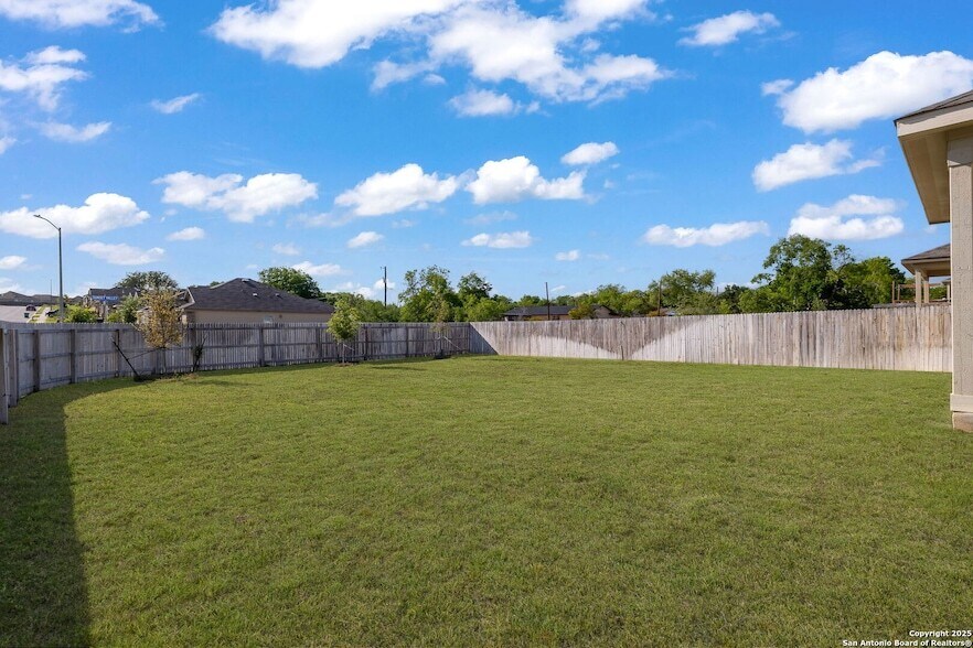 This stunning 3-bedroom, 2-bathroom residence sits on a premium oversized corner lot with complete privacy-no back neighbors to worry about. Step inside to find a thoughtfully designed layout featuring two comfortable bedrooms and a versatile flex space perfect for a home office, fitness room, media center, or game room-the choice is yours! Entertainment Ready-The heart of the home showcases an open-concept living area with soaring high ceilings and abundant natural light, creating the perfect atmosphere for gatherings and everyday living. Chef's Paradise-The well-appointed kitchen is a true showstopper, featuring: - Expansive island for cooking and casual dining - Abundant cabinet storage throughout - Premium appliances (all included- even the washer and dryer!) Primary Suite Sanctuary-Retreat to your private primary suite boasting: - Spacious bedroom with impressive high ceilings - Elegant bay windows flooding the space with natural light - Luxurious bathroom with soaking tub/shower combination - Convenient double vanity Outdoor Oasis Awaits The massive backyard is your blank canvas! The covered patio provides immediate outdoor living space, while the expansive yard offers endless possibilities for landscaping, entertaining, or recreation. Prime Location Perfectly positioned for convenience: - Close proximity to Lackland AFB, SeaWorld, and Downtown San Antonio - Easy access to major highways: 410, 1604, I-35, and Highway 90 - Quick commute to anywhere in the greater San Antonio area .
