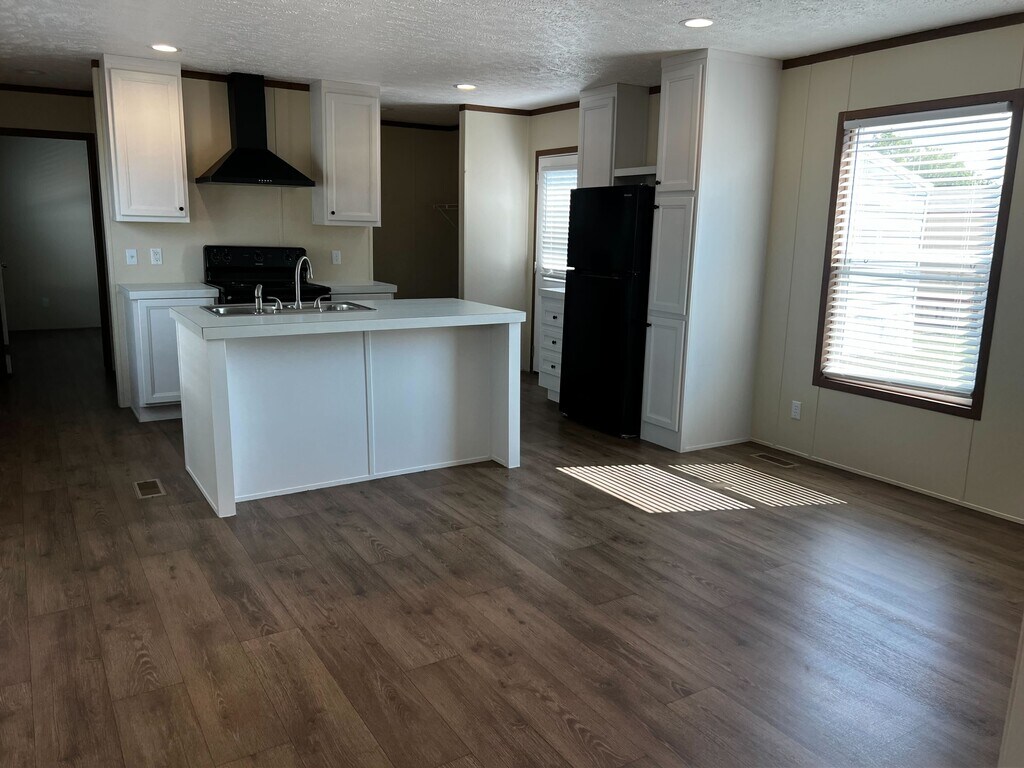 This 2023 Clayton two bedroom two bathroom home offers modern living with an open and functional layout. The spacious kitchen features a large center island with a dual sink, sleek black appliances, and plenty of cabinet storage. Natural light fills the home through large windows, highlighting the wood style flooring and clean neutral finishes. The open concept living and dining area provides a welcoming space for relaxing or entertaining. A private driveway offers convenient off-street parking. A separate storage unit is included for additional space and organization. Community amenities include a private pool, basketball court, and a playground. Located near shopping, dining, and entertainment. Discover the comfort and convenience of calling Pradera home.