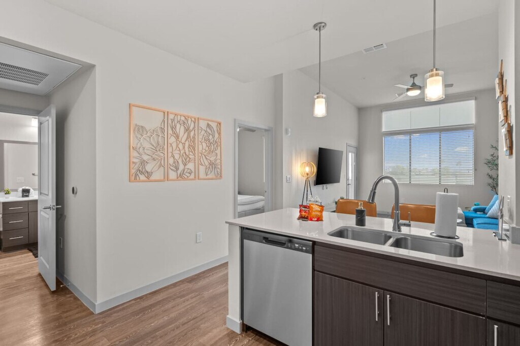 Feel at home in this resort-like apartment, just minutes from downtown Tempe and ASU. Thoughtfully designed and fully stocked, this apartment offers ultimate comfort and relaxation. The apartment features a stylish living room with elevated ceilings, a smart TV, comfortable seating, and board games. The fully stocked kitchen includes a coffee station, stainless steel appliances, and cooking supplies. Other amenities include in-unit laundry, reserved parking, EV car charging stations, outdoor BBQ grills, and a community lounge with a coffee bar. Enjoy mountain views from your private balcony with seating. The apartment community offers resort-like amenities, including an exclusive pool, a state-of-the-art fitness center, a private patio overlooking the courtyard, and well-lit outdoor firepits and a dining area. Pamper your pooch in the on-site dog park and pet wash station. Steps from lively downtown Tempe and ASU, the apartment is within minutes of highly rated restaurants, coffee shops, nightlife, and grocery stores. It's also a short drive to downtown Phoenix, Old Town Scottsdale, and PHX Sky Harbor Airport. Strict adherence to the policies is required, including no parties, smoking (of any kind), or community disturbance. Violators will be subject to a $500 fine. Includes a dedicated workspace with high-speed Wi-Fi. [SI]
