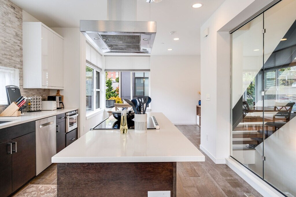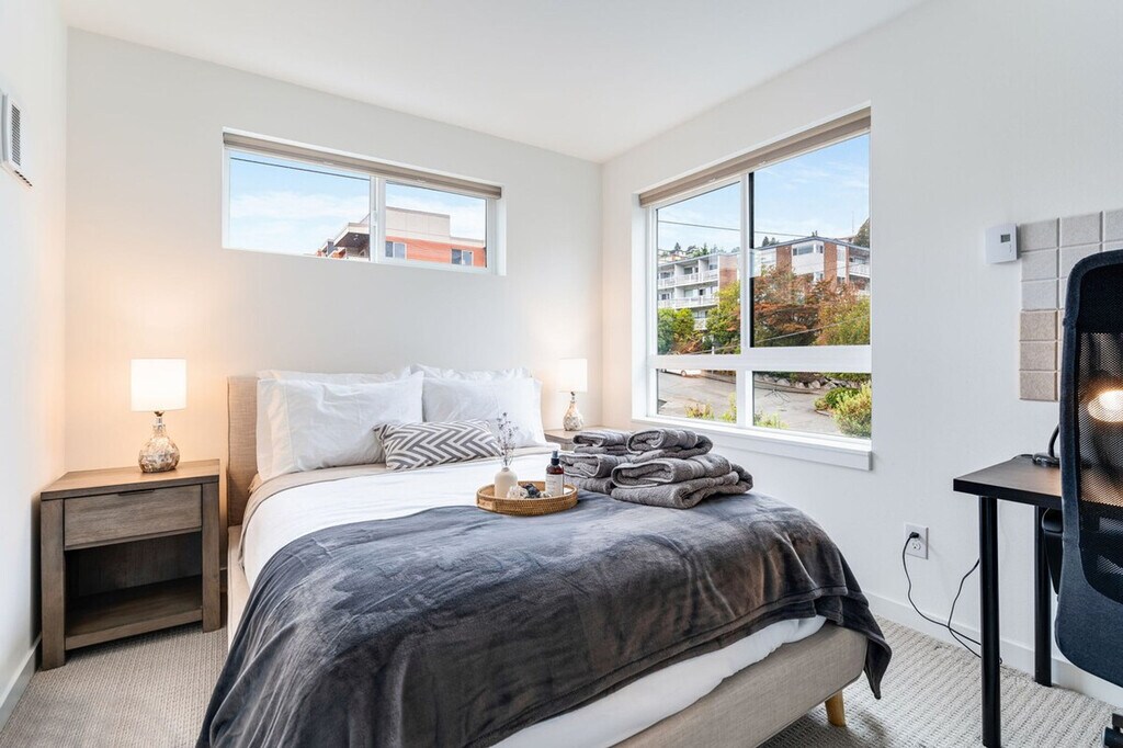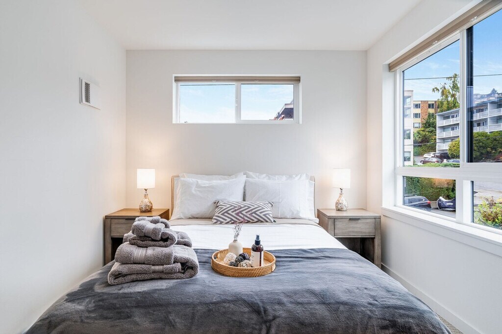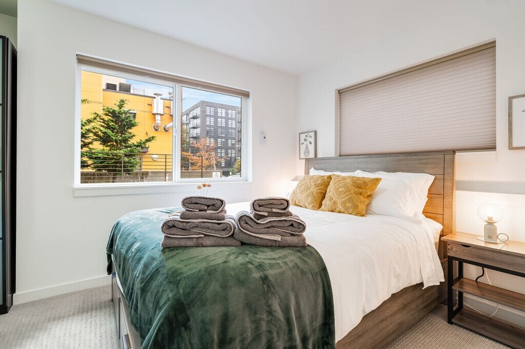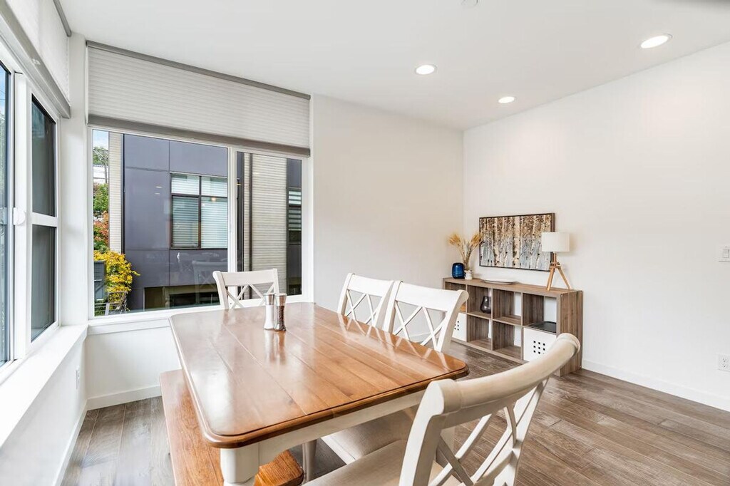 Feel at home in this bright and comfortable 3-bedroom townhome located just a block from Seattle Center. With its four levels and a few steps to entry, this 1567 sqft home offers a unique living experience. Each bedroom comes with its own bathroom, ensuring comfort and privacy. Enjoy the best location in Seattle, with easy access to the Space Needle, restaurants, cafes, and multiple bus options. The townhome features a fully stocked kitchen with appliances, cookware, silverware, servingware, spices, a Keurig coffee maker with milk frother, and a French press. Relax in the living room with a smart TV, and enjoy the convenience of an onsite washer and dryer. High-quality beds, mattresses, pillows, and linens ensure a comfortable sleeping experience. The home is equipped with A/C for the Seattle summer heat. The home does not have dedicated parking, but a city-issued guest parking permit is provided for free street parking. However, street parking is first-come-first-served and can be hard to find depending on the time of day. Located in Lower Queen Anne, this vibrant Seattle neighborhood offers a unique mix of historic charm and modern amenities. It's close to iconic landmarks like the Space Needle and cultural hotspots such as Chihuly Garden and Glass, with beautiful views of Puget Sound. Enjoy trendy eateries, cozy cafes, and lush parks, all within walking distance. With a high walk score, many dining, shopping, and entertainment options are easily accessible. Public transportation is convenient, with bus stops less than a 5-minute walk away, and ride-share services are highly recommended. This townhome is not handicap-friendly and requires comfort with stairs due to its multiple stories. The property enforces quiet hours between 10pm-8am and prohibits parties, events, smoking, vaping, digital piracy, and wearing shoes inside the home. Unauthorized pets incur a $500 fine, and there is a $500 fine per violation of the house rules. Guest access is granted via a smart lock. Includes an office desk and chair in two of the bedrooms, providing a comfortable space for remote work. Registration Number: STR-OPLI-22-001362 [SI]