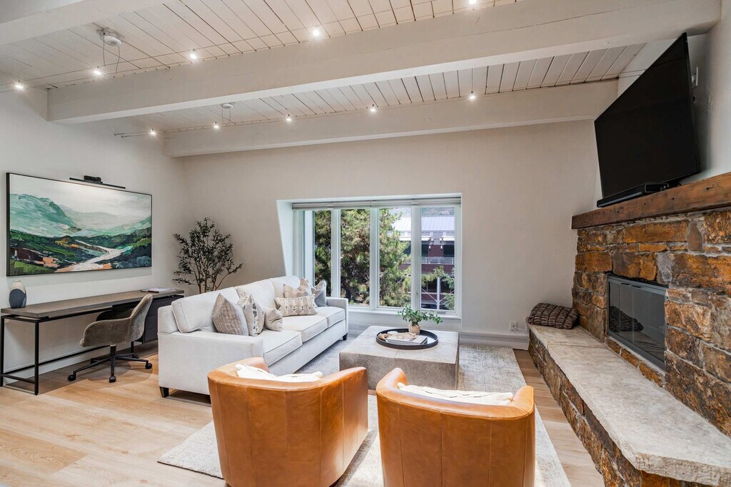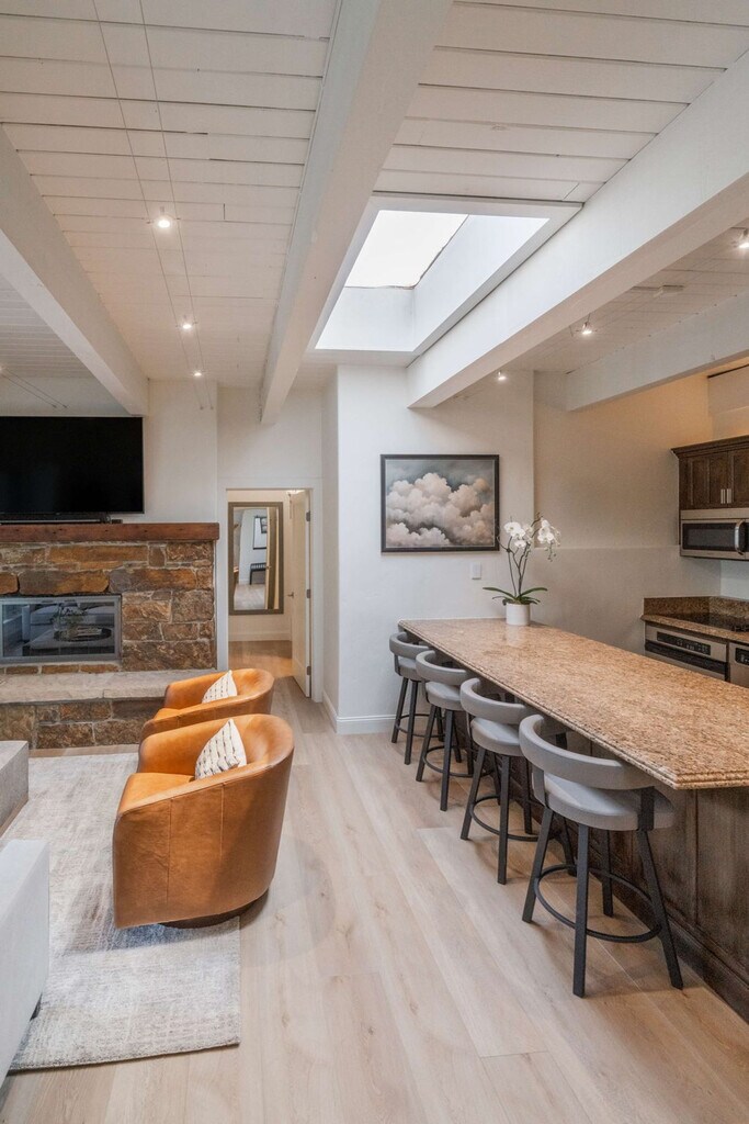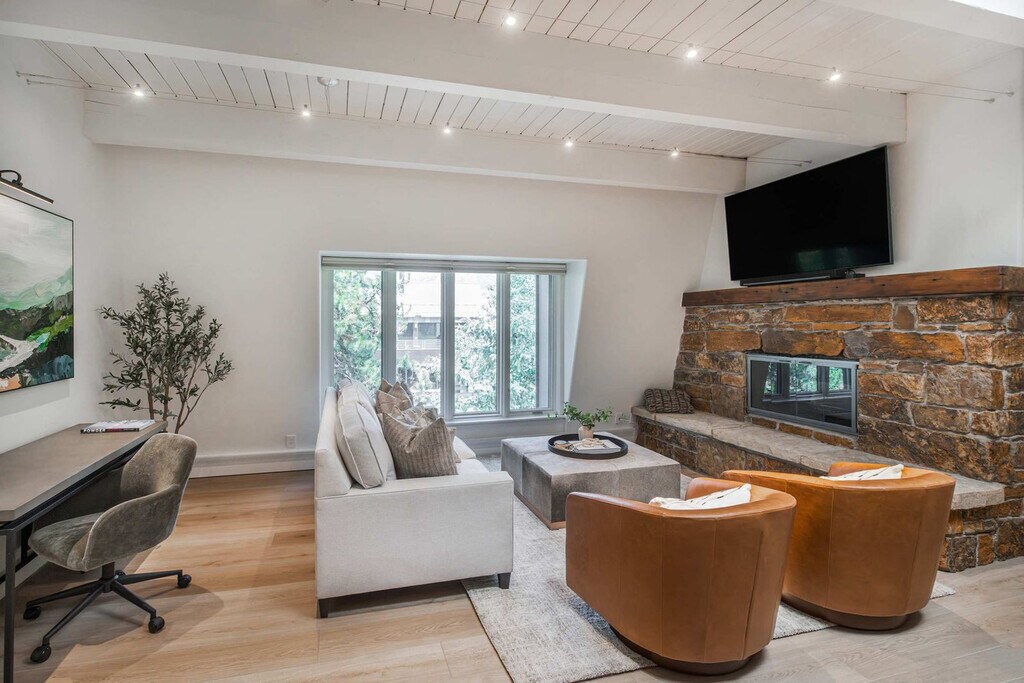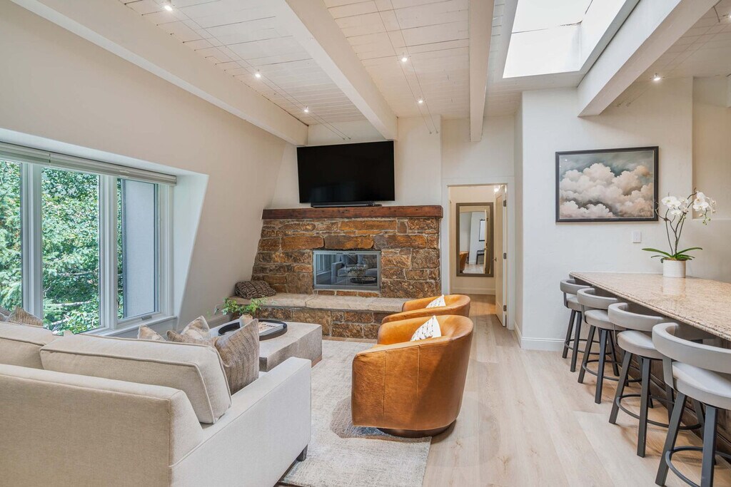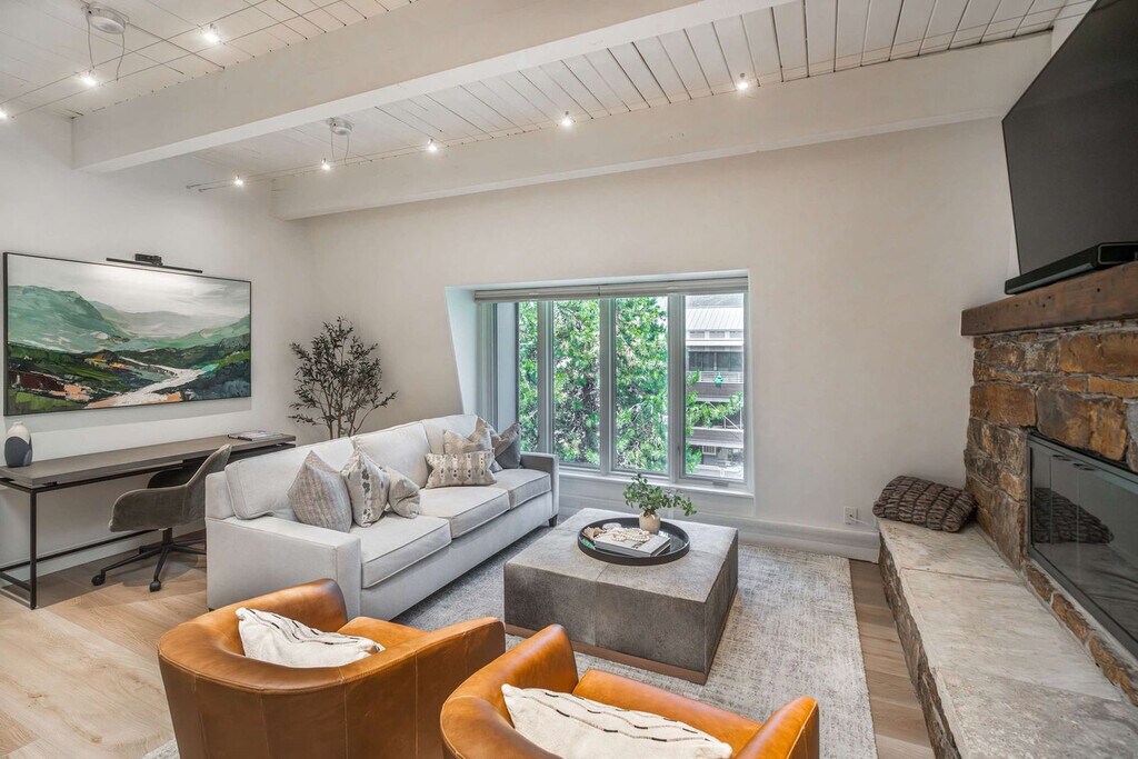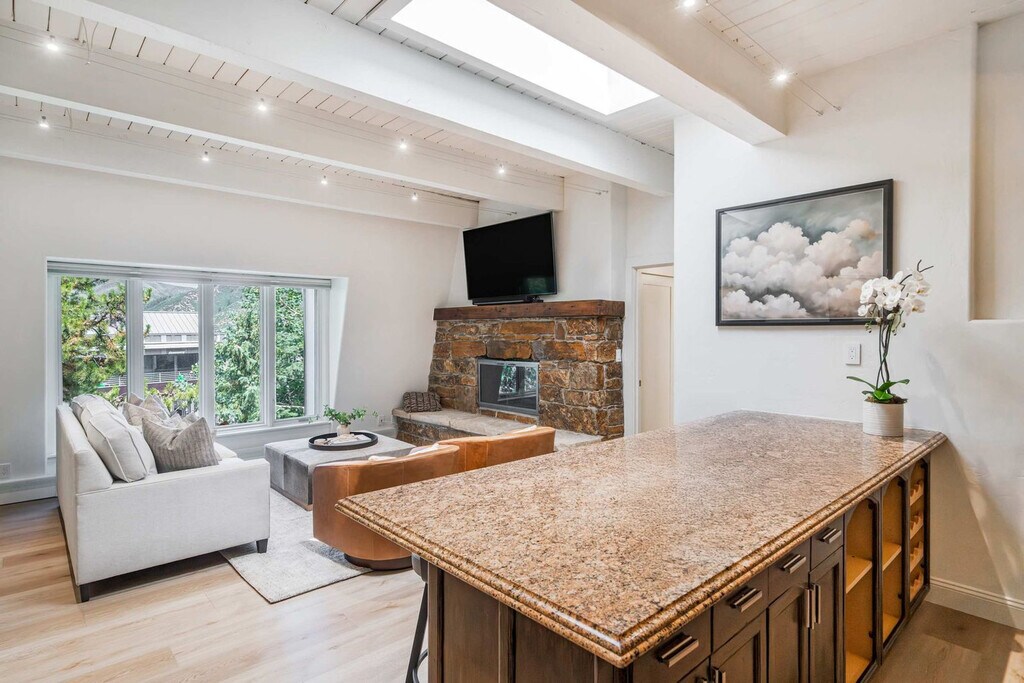 Stay in the heart of Aspen in this pet-friendly, top-floor 2-bedroom, 2-bathroom condo with breathtaking mountain views. Located just one block from the Gondola and across the street from City Market, this apartment offers access to the W Hotel's year-round pool and hot tub. Bright, peaceful, and newly updated, this thoughtfully designed condo provides a quiet retreat with vaulted ceilings, abundant natural light, and a cozy wood-burning fireplace. The apartment features a fully equipped kitchen with granite countertops and a breakfast bar, making it easy to feel at home. The open-concept living room includes a cozy wood-burning fireplace, a 65" Smart TV with streaming services, and a premium sound system. Expansive windows offer mountain views, and the plush Bernhardt queen sleeper sofa adds extra comfort. The primary bedroom boasts a king-size bed with a premium-quality mattress, while the guest bedroom offers a queen-size bed. Both bedrooms are equipped with Smart TVs and dual light window shades. Parking is available on a first-come, first-served basis, with additional street parking available using a provided residential parking pass. Cribs, pack n' plays, and high-chairs are available upon request. The building is pet-friendly for those wanting to bring their furry friends along. Located in the heart of downtown Aspen, this condo is just steps away from the Silver Queen Gondola, City Market, and the W Hotel. With restaurants, shopping, and nightlife nearby, the location is ideal for experiencing everything Aspen has to offer. Everything in downtown Aspen is easily accessible on foot, and the City of Aspen offers a complimentary on-demand ride service called the Downtowner for convenient transportation. The apartment is a top-floor unit with no upstairs neighbors, ensuring a peaceful stay. Our team is available 24/7 to assist with any needs, and early baggage drop-off and secure storage can be accommodated for your convenience. The apartment includes a dedicated workspace with a comfortable desk and chair, high-speed Wi-Fi throughout, and ample in-unit storage, making it remote work-friendly.