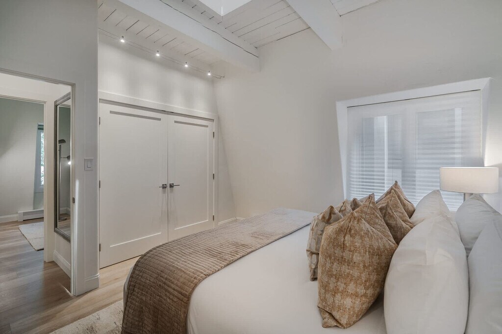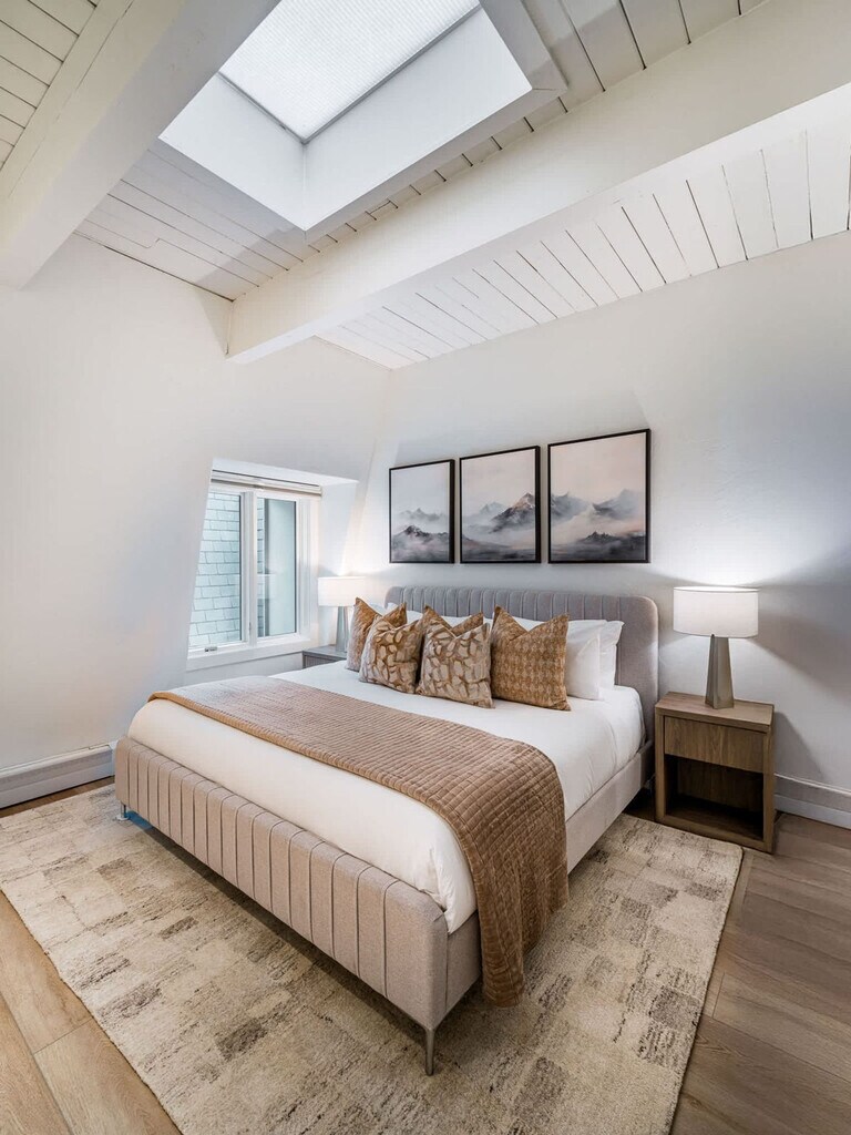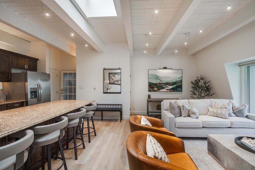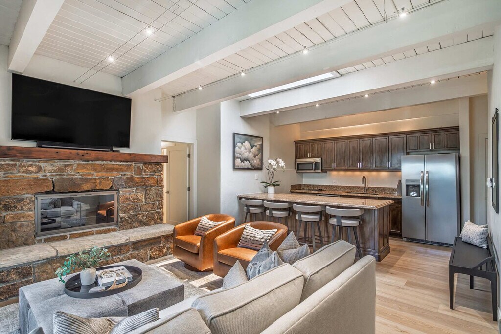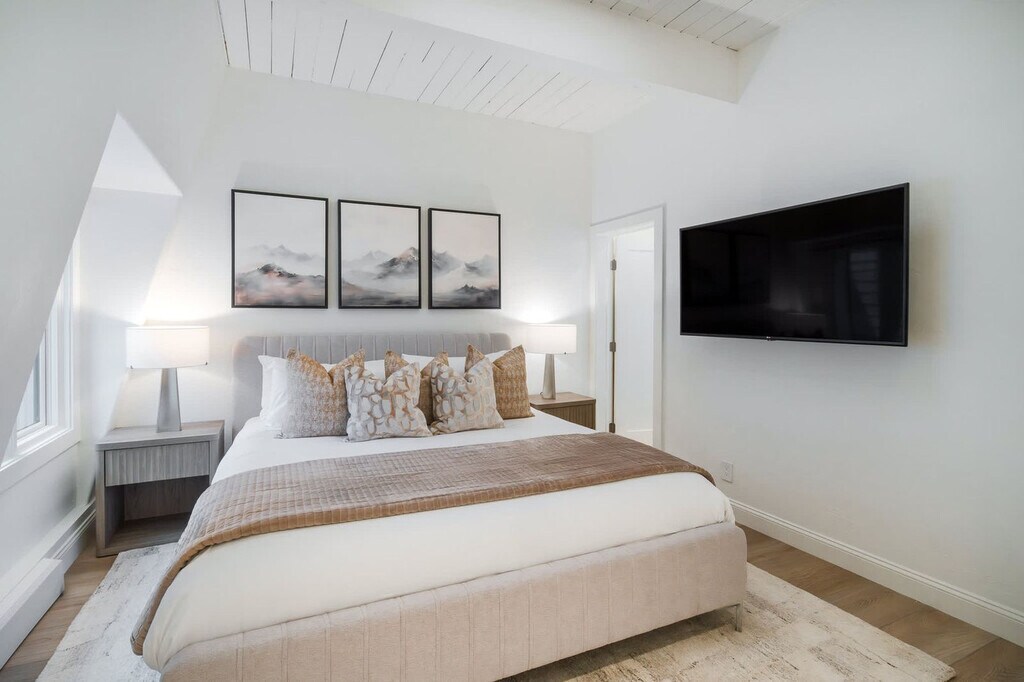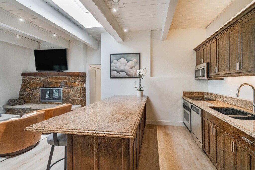 Stay in the heart of Aspen in this pet-friendly, top-floor 2-bedroom, 2-bathroom condo with breathtaking mountain views. Located just one block from the Gondola and across the street from City Market, this apartment offers access to the W Hotel's year-round pool and hot tub. Bright, peaceful, and newly updated, this thoughtfully designed condo provides a quiet retreat with vaulted ceilings, abundant natural light, and a cozy wood-burning fireplace. The apartment features a fully equipped kitchen with granite countertops and a breakfast bar, making it easy to feel at home. The open-concept living room includes a cozy wood-burning fireplace, a 65" Smart TV with streaming services, and a premium sound system. Expansive windows offer mountain views, and the plush Bernhardt queen sleeper sofa adds extra comfort. The primary bedroom boasts a king-size bed with a premium-quality mattress, while the guest bedroom offers a queen-size bed. Both bedrooms are equipped with Smart TVs and dual light window shades. Parking is available on a first-come, first-served basis, with additional street parking available using a provided residential parking pass. Cribs, pack n' plays, and high-chairs are available upon request. The building is pet-friendly for those wanting to bring their furry friends along. Located in the heart of downtown Aspen, this condo is just steps away from the Silver Queen Gondola, City Market, and the W Hotel. With restaurants, shopping, and nightlife nearby, the location is ideal for experiencing everything Aspen has to offer. Everything in downtown Aspen is easily accessible on foot, and the City of Aspen offers a complimentary on-demand ride service called the Downtowner for convenient transportation. The apartment is a top-floor unit with no upstairs neighbors, ensuring a peaceful stay. Our team is available 24/7 to assist with any needs, and early baggage drop-off and secure storage can be accommodated for your convenience. The apartment includes a dedicated workspace with a comfortable desk and chair, high-speed Wi-Fi throughout, and ample in-unit storage, making it remote work-friendly.