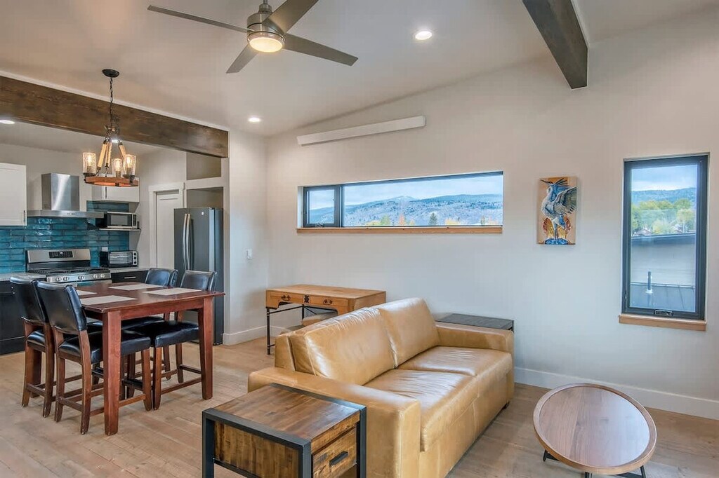 Welcome to The Gem Suite, a cozy and convenient retreat located in the heart of Teton Valley, offering breathtaking views of downtown Victor, Idaho. Feel at home as you explore the wonders of Yellowstone, Grand Teton, Jackson Hole, and Grand Targhee, all within easy reach. The apartment features an open floor plan with large windows that showcase stunning views of the town and surrounding mountain ranges. The well-equipped kitchen is perfect for preparing a feast or enjoying a cozy cup of coffee in the morning. A large balcony on the south side of the home is ideal for grilling dinner after a day of adventure. The Gem Suite is ideally situated across from the Victor Depot, providing easy access to the Teton Valley Bus Shuttle. This is especially convenient in winter for reaching Grand Targhee Resort without the hassle of winter driving. The shuttle also stops in Driggs, offering easy access to dining and grocery options. Distances to nearby attractions include Yellowstone's West Entrance (1 hr 45 min), Grand Teton (43 min), and Jackson Hole Mountain Resort (37 min). Most vacation homes in the area, including this one, do not have air conditioning. While it can get warm during midday in summer, temperatures cool significantly at night. We provide fans to circulate the cool breeze, and recommend opening windows and screen doors in the evenings. Please adhere to house rules: no events, smoking, or vaping are allowed, and quiet hours are from 9 pm to 8 am. Fines apply for violations, including a minimum $500 fine for smoking or vaping indoors, and failure to follow house rules or check-out procedures.