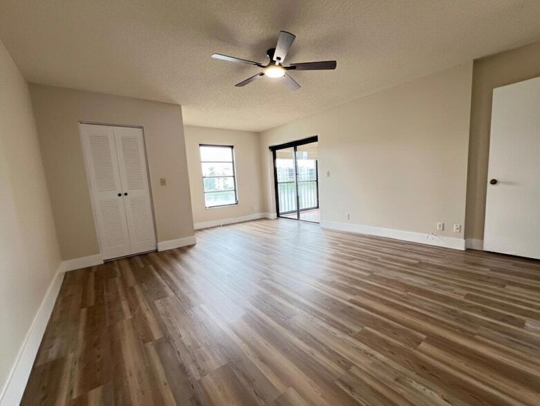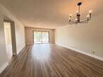 Unfurnished annual rental is available NOW in the serene 55+ Huntington Lakes! This spacious 2/2 offers 1230 sq ft under air + a screened balcony overlooking the lake. Freshly painted throughout in SW Natural Linen, with brand new wood look flooring & baseboards installed September 2025. . Lovely eat in kitchen with large pantry, stainless appliances, Lots of closets + utility room with washer/dryer, XL primary bedroom with 2 walk in closets, newer vanity and toilet with bidet. Brand new ceiling fans in both bedrooms and on the patio. Huntington Lakes is a 24/7 manned gated community with an abundance of lakes and walking trails. Additional amenities include: recently renovated clubhouse, tennis, pickleball, pool, theatre, social clubs & more.