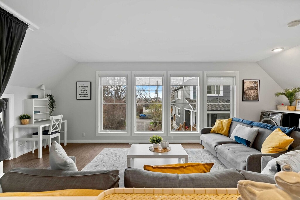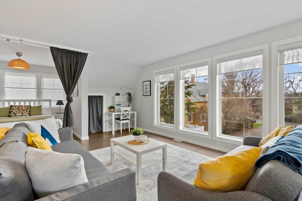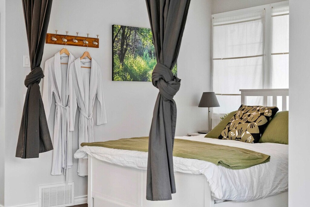Welcome to the Local Loft, a studio-style loft nestled against a quiet hillside in Olde Towne Okotoks. This bright and serene retreat is the perfect escape for couples, small families, or close friends. Located above the garage, the loft features large windows that flood the space with natural light, offering south-facing views of historic Elma Street. Enjoy the convenience of being steps away from coffee shops, art and yoga studios, boutiques, and more. This cozy loft is full of character, featuring a queen bed with a privacy curtain, a futon-style sofa bed, and a charming secret play nook for kids. The simple kitchen includes a Keurig machine, oven, stove, microwave, fridge, freezer, toaster, and kettle, along with a dining table that seats three. Enjoy fresh coffee and a small workspace with Wi-Fi, but note that there is no TV, just peace and quiet. The loft also includes a washer and dryer for your convenience. Enjoy free parking on the driveway and street. Pets are allowed with a pet fee charged per pet, plus any additional cleaning needed. The Local Loft is ideally situated just a 5-10 minute walk from restaurants, bars, and shops, and a 35-minute drive from downtown Calgary (Stampede). For those looking to explore further, it's a 25-minute drive to High River Hospital and South Health, and a 1.5-hour drive to Banff. Surrounded by nature and frequent deer sightings, this is a peaceful retreat just outside the city. Quiet hours are from 10:00 PM to 7:00 AM. Please remove your shoes at the entranceway, and note that no overnight guests are allowed unless included in the booking. A clean home is a happy home, so please clean your dishes before you go. If the home is left in an exceptionally messy state, a $60 fee will be charged for every extra hour of cleaning required. Early check-in or late check-out is available for an additional $50 per hour, subject to approval and availability. Pets are allowed with a pet fee, and smoking indoors or near windows is prohibited, resulting in a $1000 fee for violations. Parties or excessive noise are not allowed, with a $1000 fee for misbehavior. Be mindful of water use with more than two people, as the hot water is minimal. The loft includes a small workspace with a desk and chair, along with Wi-Fi for your remote work needs. A laptop computer is not included. [SI]