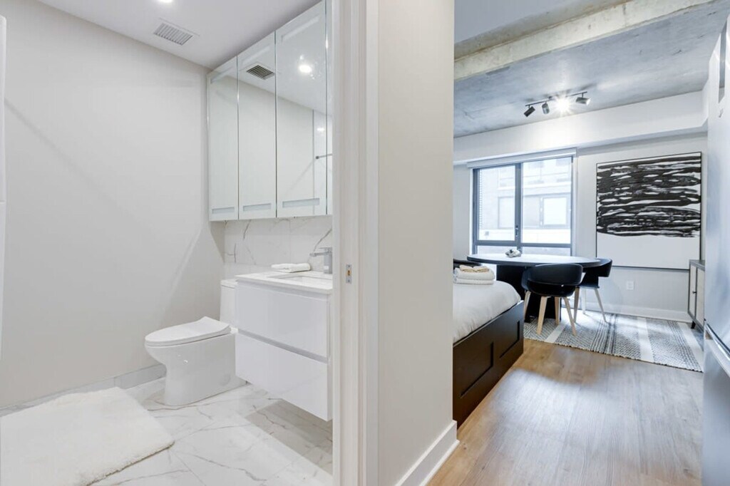This newly constructed building, completed in 2023, offers a variety of high-end units to its tenants. This studio apartment is fully stocked with the necessary and basic items for a comfortable stay. Located on the 2nd floor, the building features a rooftop patio and a ground floor garden area, and is equipped with an elevator. Feel at home in the heart of Montreal, perfectly situated for discovering the best spots in town, including the Old Port, Griffintown, downtown, and the Lachine Canal. Welcome to this newly furnished studio apartment, perfect for two guests. The apartment boasts new furniture, a fully stocked kitchen, some complimentary coffee and tea, a smart TV for streaming your favorite shows and movies, high-speed Wi-Fi, and an in-unit washer and dryer. Enjoy the rooftop patio and the convenience of a store next to the building. A baby crib is available for an additional fee, with limited quantities. Pets are accepted at our discretion and for a fee. The apartment is within walking distance to many shops, restaurants, bars, and cafes. It's a 5-minute walk to Old Montreal, a 10-minute walk to Notre-Dame Basilica, and a 15-minute walk to Bell Center. Downtown Montreal is just 10 minutes away by transport, and Square Victoria Metro Station is a 5-minute walk away. The area is well-served by taxis, Bixis, public transit, and Uber, with a 2-minute walk to an IGA grocery store and 30 minutes to/from the airport. The building is equipped with security cameras in the common area hallways, stairwells, and entrances. All guests must adhere to building policies, rules, and general maintenance requirements. Quiet hours are between 22:00 and 8:00. The apartment accommodates a maximum of two people. No parties and no smoking are allowed inside the unit. Be mindful of the neighbors. You must fill out the check-in form prior to your arrival. A laptop computer is not included. [SI]