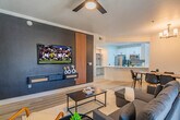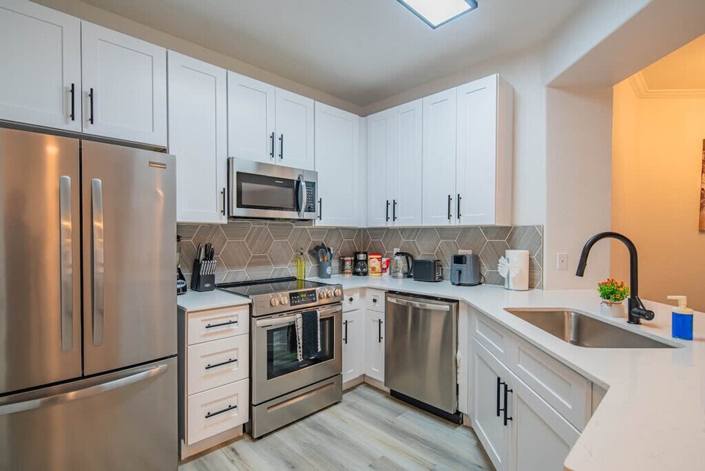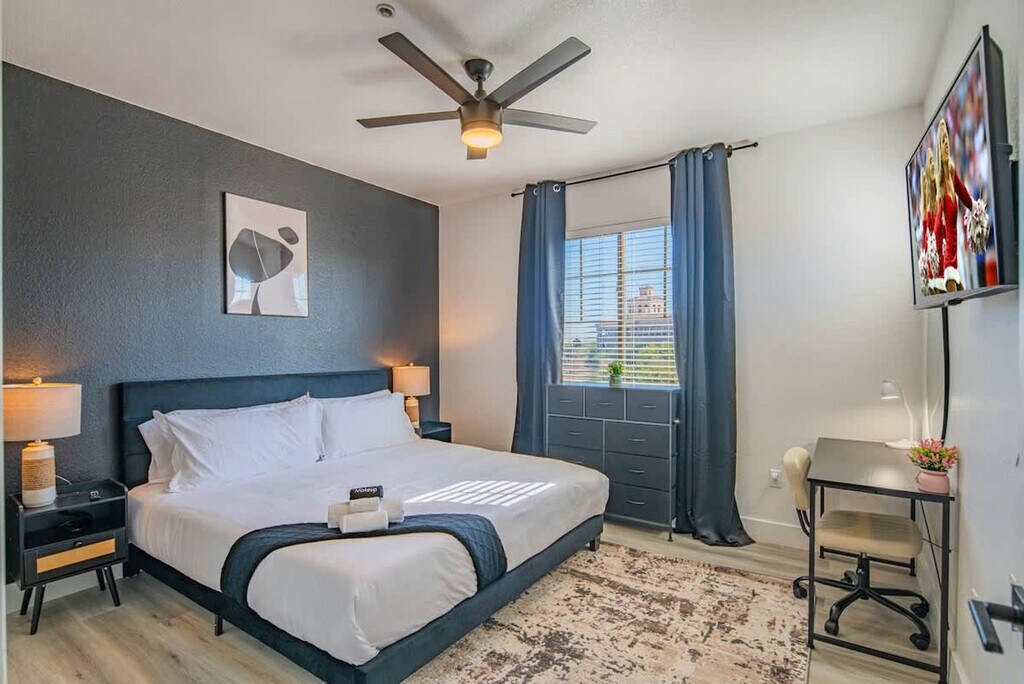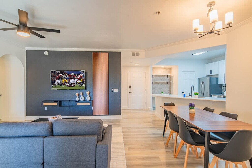 Unwind in this modern and stylish apartment in Glendale, located on the 3rd floor of a vibrant area. You're just minutes away from top attractions like State Farm Stadium and the Westgate Entertainment District, making it easy to explore the best of Glendale whether you're here for business or leisure. Relax in this 2-bedroom, 2-bathroom unit designed with a socially and environmentally conscious living environment in mind. The innovative open-concept design blends the living and dining areas with the fully equipped kitchen, creating a modern and sleek living experience. The living room is ideal for relaxing and enjoying the company of friends and family, featuring a sofa bed, a 4K 55" HDR Smart TV, and a coffee table. The kitchen is equipped with a microwave, stove, oven, refrigerator/freezer, dishwasher, coffee maker, electric kettle, and all necessary utensils, along with a dining table and chairs. The bedroom offers a king-size bed, office desk, and reading lamps, while the bathroom is stocked with essential toiletries. Parking is available on the premises, with instructions provided at check-in. Pets are allowed depending on size or if they are service animals, with an additional cleaning fee required per pet: $25 per night for 1-7 nights, $200 for 8-29 nights, and $300 for 30+ nights. There is a 2-pet maximum, and only cats and dogs are allowed. Breed restrictions apply, and a $500 fee will be charged if pets are brought without prior notification. Located in a prime area of Glendale, this apartment offers easy access to top attractions such as State Farm Stadium and the Westgate Entertainment District. The vibrant neighborhood ensures that you're never far from the action, making it an ideal spot for both business and leisure travelers. This property does not have an elevator, so guests need to walk upstairs to reach the unit on the 3rd floor. Noise monitors are installed to measure noise levels, and tampering with them will incur a fee. Security cameras are present in the hallways for safety. Guest verification is required, including providing a government-issued ID and matching credit card prior to check-in. A rental usage agreement must be signed, and check-in instructions may be withheld until verification is complete. Repeated violations may involve local law enforcement, with associated expenses being the responsibility of the guest. [SI]
