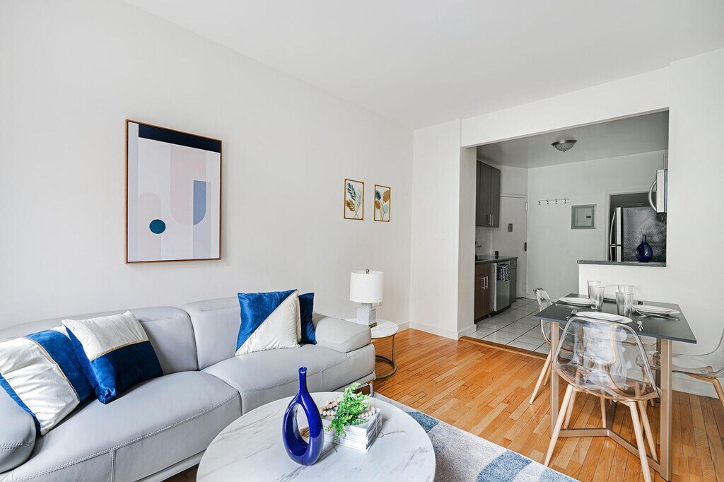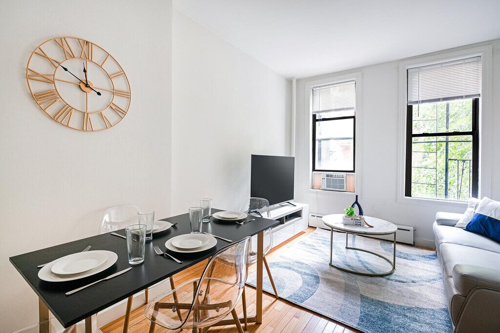 Feel at home in this contemporary 1-bedroom, 1-bathroom fully furnished apartment, perfectly situated on the 2nd floor of a walk-up building in the heart of NYC. This apartment offers both comfort and convenience, making it the ideal home for anyone looking to experience the best of New York City. The modern kitchen comes fully equipped with stainless steel appliances, including a dishwasher and oven, complemented by sleek countertops and many more utilities. The sophisticated living room features polished hardwood floors and a dining table for four, providing a perfect space for relaxation and entertainment. Located in the heart of NYC, this apartment offers unparalleled access to the vibrant city life, with easy access to public transportation, dining, shopping, and cultural attractions. Washer and dryer are conveniently located on the floor. The apartment is equipped with flat-screen TVs with basic channels. Air conditioning and heat are available for your comfort. Stay connected with wireless internet provided, ensuring a seamless remote work-friendly environment. [SI]