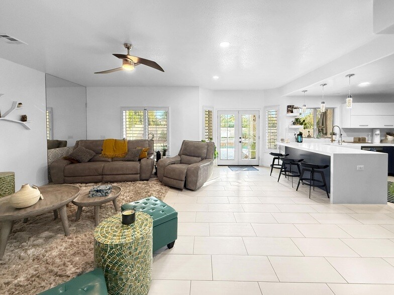 Available May 1, 2026. Fully furnished and beautifully remodeled, this stunning two-story, four-bedroom, three-bath home is perfectly situated in the heart of Palm Desert, providing easy access to all areas of the Coachella Valley. Inside, you'll find elegant porcelain tile flooring, a cozy fireplace in the main living space, recessed lighting, and an open layout designed for comfort and style.The chef's kitchen is a highlight, featuring quartz countertops, a double waterfall peninsula, custom cabinetry, stainless steel appliances, and a stylish wet bar--perfect for entertaining guests. Step outside to the backyard, where breathtaking views and a resort-style pool and spa create the ideal indoor-outdoor lifestyle.On the main level, there's a guest bedroom and a dedicated laundry room. Upstairs, discover three additional bedrooms, including the primary suite with a private balcony overlooking the pool, a luxurious walk-in closet, and a spa-like bathroom with a custom-tiled shower and soaking tub.The home also includes owned solar panels, offering significant utility savings. The owners take care of pool service, landscape maintenance, and cleaning, making this a truly hassle-free living experience. Whether you're relocating to the desert or seeking a high-quality, long-term residence in central Palm Desert, this property is an exceptional opportunity to enjoy luxurious desert living.