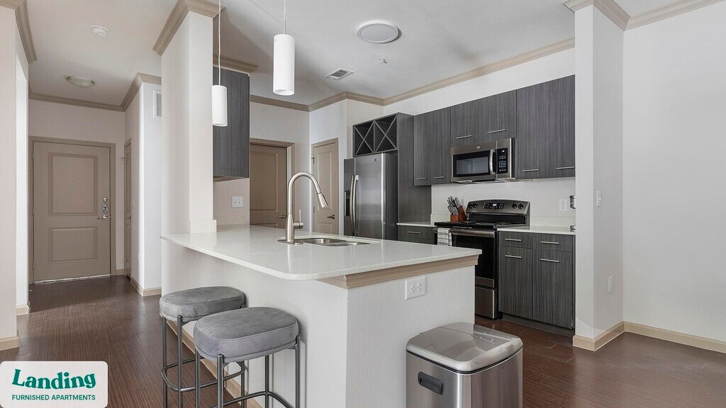 Landing offers flexible lease terms from weeks to months. Please always visit our website or contact us for the latest pricing & availability. Stay longer, save more: 6-Month Minimum base rent: starts at $2427/mo 12-Month Minimum base rent: starts at $2172/mo Landing offers flexible leases across a network of over 35,000 fully-furnished apartments throughout 375+ cities so you can rent on your terms, practically anywhere, and avoid the hassle of paying deposits or application fees. Visit to learn about all the benefits of a Landing membership, see our competitive up-to-date pricing, explore available apartments, take virtual tours, and make reservations online without jumping through traditional rental hoops. Landing's apartments at The View at Crownridge are designed for comfortable, easy living, with the ability to stay as long as you like. Experience living with Landing Every apartment is outfitted with all the modern essentials including: custom-designed furnishings, a fully-equipped kitchen with deluxe stainless steel appliances, a gourmet coffee maker, premium linens, Smart TVs, and incredibly fast, reliable internet for working from home. When you live with Landing, you'll enjoy a hassle-free experience with the added benefit of 24/7 access to our dedicated member experience team. Some of the nitty-gritty: a background check and proof of income are required; we're completely smoke-free; bundled utility packages and pricing vary based on length of stay; pet-friendly options available; listed price reflects a 12-month minimum stay.