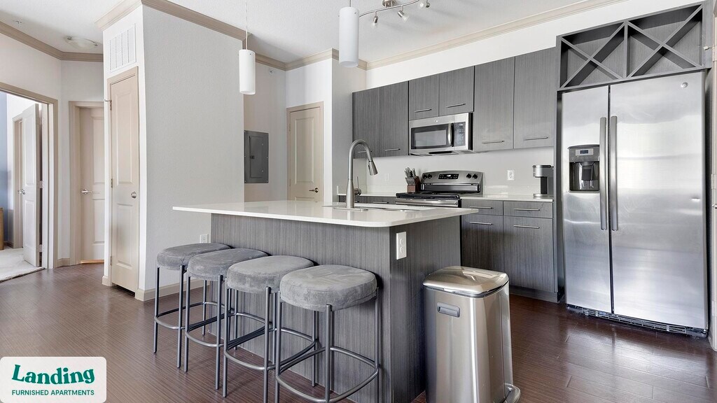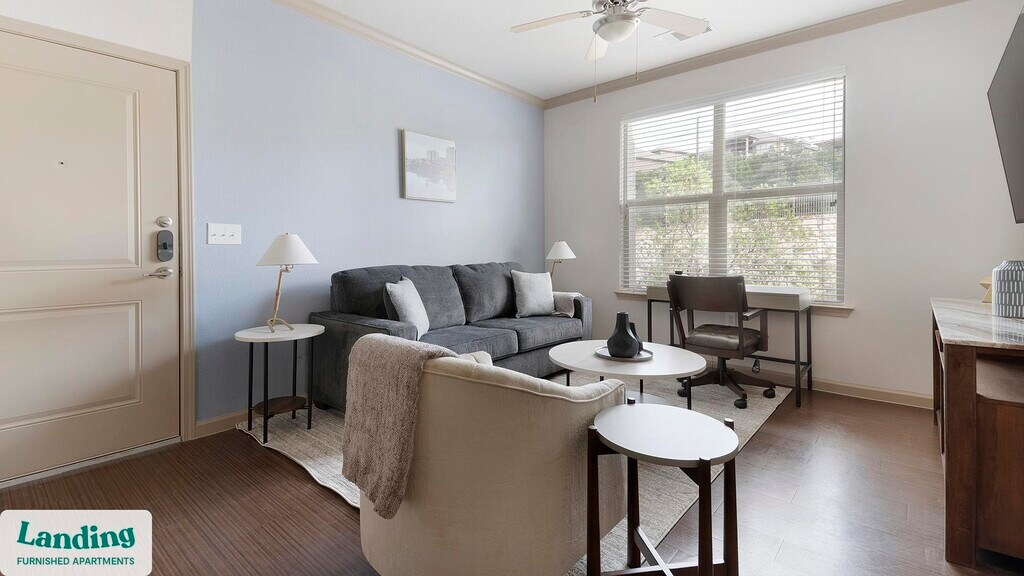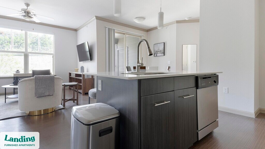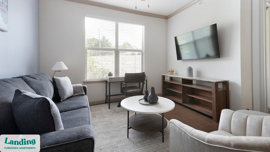 Landing offers flexible lease terms from weeks to months. Please always visit our website or contact us for the latest pricing & availability. Stay longer, save more: 6-Month Minimum base rent: starts at $1925/mo 12-Month Minimum base rent: starts at $1633/mo Landing offers flexible leases across a network of over 35,000 fully-furnished apartments throughout 375+ cities so you can rent on your terms, practically anywhere, and avoid the hassle of paying deposits or application fees. Visit to learn about all the benefits of a Landing membership, see our competitive up-to-date pricing, explore available apartments, take virtual tours, and make reservations online without jumping through traditional rental hoops. Landing's apartments at The View at Crownridge are designed for comfortable, easy living, with the ability to stay as long as you like. Experience living with Landing Every apartment is outfitted with all the modern essentials including: custom-designed furnishings, a fully-equipped kitchen with deluxe stainless steel appliances, a gourmet coffee maker, premium linens, Smart TVs, and incredibly fast, reliable internet for working from home. When you live with Landing, you'll enjoy a hassle-free experience with the added benefit of 24/7 access to our dedicated member experience team. Some of the nitty-gritty: a background check and proof of income are required; we're completely smoke-free; bundled utility packages and pricing vary based on length of stay; pet-friendly options available; listed price reflects a 12-month minimum stay.