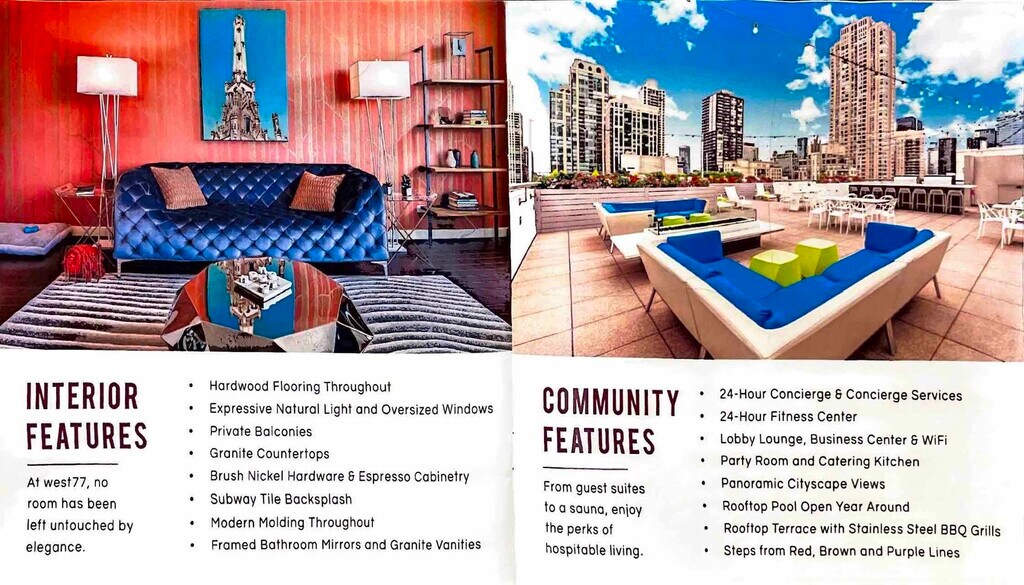 SUBLET from February 1st ending July 31st 2026. Welcome home to West 77,a luxury apartment community ideally situated in the heart of River North. This spacious 1-bedroom,1-bath residence offers 694 sq ft of thoughtfully designed living space,plus a large south-facing balcony with floor-to-ceiling doors and sweeping city views. The open-concept living and dining area features hardwood floors and easily accommodates a large sectional and a full six-seat dining table,perfect for entertaining. The well-appointed kitchen includes stainless steel appliances,quartz countertops,and ample cabinetry for all your storage needs. Retreat to your king-size bedroom (or queen with a work-from-home setup),complete with a custom closet system offering excellent built-in organization. Additional storage continues in the expansive front hall closet,ideal for coats,shoes,and everyday essentials. The luxury bath features a large vanity with quartz counters,under-sink storage,and a shower/tub combo. West 77 elevates your lifestyle with full-service amenities,including: 24-hour door staff,24-hour fitness center,Rooftop terrace with grills,Resident lounge with business center and party room,Indoor pool and sauna - usable year-round and On-site laundry with card/app-operated machines. Phenomenal location puts you within an 8-minute walk to multiple train lines,steps from major bus routes,and moments from top-tier shopping,dining,nightlife,and several grocery options. This is true city living at its finest,don't miss your chance to call West 77 home! MLS# MRD12556585 Based on information submitted to the MLS GRID as of [see last changed date above]. All data is obtained from various sources and may not have been verified by broker or MLS GRID. Supplied Open House Information is subject to change without notice. All information should be independently reviewed and verified for accuracy. Properties may or may not be listed by the office/agent presenting the information. Some IDX listings have been excluded from this website. Prices displayed on all Sold listings are the Last Known Listing Price and may not be the actual selling price.
