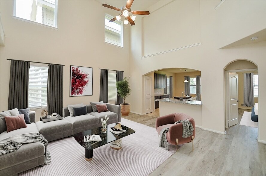 This beautifully updated residence features a uniqued, high-ceiling living room that is light and bright, creating an inviting and spacious atmosphere. The home boasts newly installed wood flooring throughout, with no carpet to worry about, move-in ready.The functional chef's kitchen is perfect for culinary enthusiasts, offering an island for extra workspace and storage. The master bedroom ensuite is conveniently located downstairs, providing a private retreat.Located near a park, this home offers convenience and easy access to HEB, major highways, and a variety of restaurants. Whether you're looking to entertain or simply enjoy a comfortable lifestyle, this property is ready to welcome you home.Don t miss the chance to lease this beautiful home!