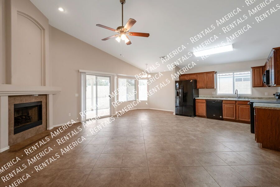 This inviting home offers three bedrooms plus a versatile office or den perfect for working from home or extra-living space. Enjoy neutral tones throughout, with ceramic tile in main areas and plush carpet in the bedrooms for comfort. The sliding glass door opens to a covered patio and low-maintenance yard with decorative rock landscapingno mowing required! Located near top-rated schools and beautiful city parks, this home also offers added privacy with no rear neighbors. One Time Admin Fee: $300, Service Fee: 2%. $39/month Resident Benefits Package, Helping Heroes Discount Available! Carpet Cats Allowed Ceramic Tile Disposal Garage No Pets Allowed