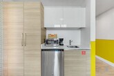 Feel at home in this brand-new studio apartment, steps from the legendary Hollywood Beach Boardwalk. No car is needed to enjoy this centrally located apartment. This well-appointed studio mixes natural wood and stone with organic textures and state-of-the-art technology. It offers a stainless steel refrigerator, microwave, dishes, coffee maker, and toaster. The spacious bedroom includes a hairdryer, electronic safe, iron/ironing board, and TV. Enjoy ceramic floors, electronic door locks, European-style cabinetry, and modern-style designer fixtures and faucets. Enjoy access to the rooftop infinity pool, hot tub, gym, and sundeck. A pack-n-play crib is available upon request. One pet per unit is welcome for free, but fees may apply for additional pets. Note that the condo has a 25 lbs restriction for pets (doesn’t apply to ESA). Parking is available at the condo for $42 a day, or you can issue a public parking pass for the whole month for $110 plus taxes, which allows you to park on any street or city parking lot (300 Connecticut St). Located along North Ocean Drive in the lively community of Hollywood Beach, this apartment puts you at the heart of the action. Within walking distance of the famous Hollywood Beach Broadwalk and the beach, you can enjoy exciting activities such as jet skiing, fishing, boating, biking, and golf. South Beach and Miami are a short drive away. The Broadwalk has bars, restaurants, boutiques, and shops. For a truly local experience, you can visit The Le Tub Saloon, Capone's Italian, GG's Waterfront Grill, Nick's Bar & Grill, and Taverna Opa. Check-in is any time after 4PM and check-out is any time before 11AM. Swimming is at your own risk, as there is no lifeguard on duty, and children must be supervised by a responsible adult at all times. For your safety, no diving or running is allowed. Please keep all doors closed and the air conditioning on at all times to help prevent condensation and property damage. The public beach and Boardwalk within the City of Hollywood Beach does not allow pets (service animals are still welcome!). [SI]