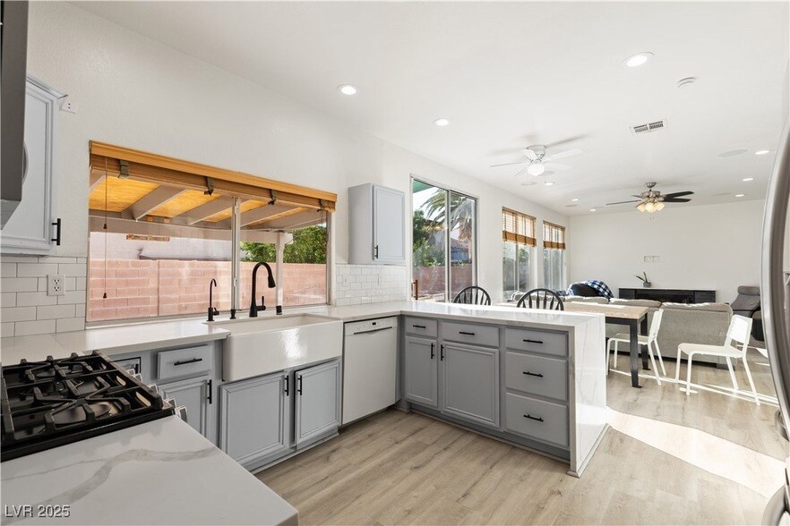 Nestled in a family friendly neighborhood near Silverado Ranch, this recently renovated 4 bed, 3 bath home offers a perfect blend of suburban tranquility and urban enjoyment. Even with the impressive amount of living space there is still plenty of room to play, entertain, and unwind outside in the generous 6,970 square foot lot. The first floor flows seamlessly from the formal living and dining area into a cozy family room. The kitchen boasts a quartz waterfall countertop, stainless steel appliances, and a walk-in pantry. The first floor bedroom with attached full bath also offers the choice of a home office or guest retreat. The primary suite is a true sanctuary with an en-suite bathroom featuring dual vanities, a soaking tub, and a separate shower. Location is everything, and this home delivers! Only 6 miles from The Strip, under 4 miles to McCarran Airport, and less than 2 miles from Sunset Park. Enjoy effortless access to I-15 and I-215 for daily activities and weekend getaways.