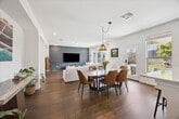 This beautiful two-story home combines modern comfort and thoughtful design in a bright, open layout. The spacious living room flows seamlessly into the dining area and full kitchen, creating an inviting space for everyday living or entertaining. Natural light fills the home, highlighting the clean finishes and warm tones throughout.Upstairs, you ll find all three bedrooms including a generous primary suite with an ensuite bathroom plus a versatile secondary living area perfect for a media room, play space, or home office. The home features carpet only in the bedrooms, providing a cozy retreat, and sleek flooring on the main level for easy maintenance.Step outside to enjoy a private, fenced-in backyard with a covered patio ideal for relaxing or dining outdoors. Furniture is negotiable, making this home move-in ready and effortlessly stylish.
