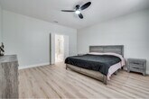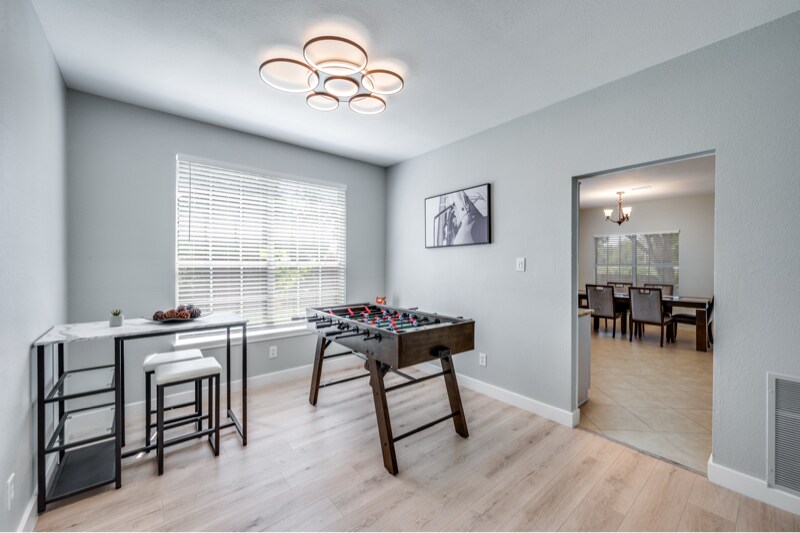 Property Id: 2160039 This two-story house offers a roomy, relaxed layout with five full bedrooms and two and a half baths, spread over 2,640 square feet. It's set on a corner lot in a cul-de-sac, which adds peace and privacy. Inside, you'll find updated laminate floors throughout and a layout made for both hanging out and having guests over. The living room features an oversized sectional couch, a smart TV, a coffee table, and an ornamental fireplace that adds enough character without fussiness. The kitchen is fully open to the dining area and comes ready with granite countertops, stainless steel appliances, and tons of cabinet space. The dining area seats six comfortably and sits right by a window for natural light. If you're into game nights or just need a bonus hangout zone, there's a game room with a foosball table and a table for two, plus an upstairs loft with another smart TV, a couch, and even a bean bag chair for kicking back.The main bedroom is on the ground floor and has a king-sized bed.