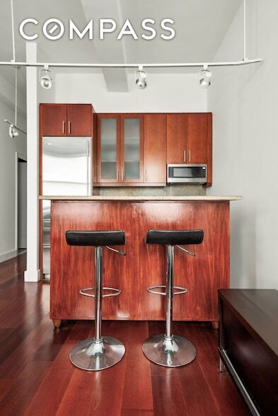 Come home to this stunning loft-style condominium in the heart of the Financial District. This spacious residence features soaring 10 8 beamed ceilings and three oversized windows, filling the home with natural light and an airy, open feel. The chef s kitchen is outfitted with top-of-the-line Sub-Zero and Miele appliances, perfect for everyday living and entertaining. A built-in queen-size sleeping loft accessed by a striking wrought-iron staircase maximizes space and style. Below the loft is a dedicated home office area with recessed lighting and built-in speakers, ideal for work-from-home living. Two generous closets, including a walk-in, provide excellent storage. Two washers and two dryers are conveniently located on the floor. The South Star is a full-service pre-war condominium offering 24/7 concierge service, an on-site garage, and dry cleaning. With the Fulton Street subway entrance and a 24-hour supermarket directly across the street and every neighborhood essential within a single block this location is unbeatable. Application Fees: Security Deposit - 1 month rent $65 - Digital Submission Fee $250 Processing Fee (non-refundable) app admin fee - 5% of Total(excluding Digital Submission & Initiation Fees) $1,000 Move In Deposit (refundable) - Upon approval $400 Move In Fee (non-refundable) - Upon approval