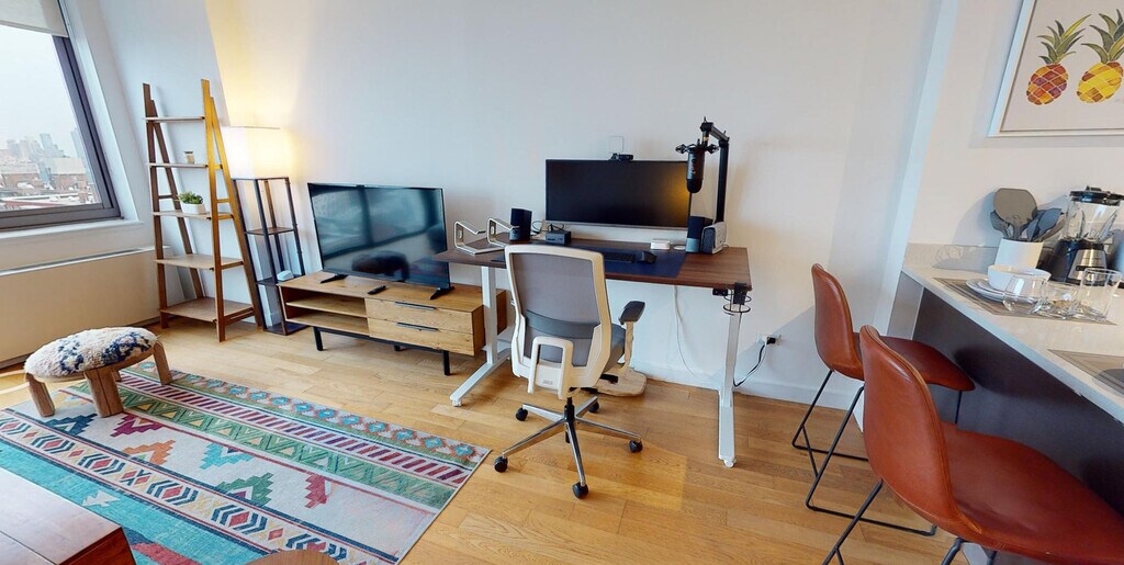 Picture yourself at home in one of the most coveted neighborhoods, at the center of the most exciting city in the world. From unmatched views of Central Park to state-of-the-art amenities, designer furnishings, and a prime location, this apartment at Columbus Square allows you to craft the New York City lifestyle you’ve always dreamed of. Overlooking Manhattan’s famous Upper West Side and its world-class shopping, restaurants, museums, universities, theater, and more, this impressive complex of 5 buildings provides access to everything you could need or want from the moment you step out the door. This fully furnished, 1-bedroom apartment is custom designed for the remote worker looking for a comfortable and inspiring environment in which to be productive. This unit includes a fully equipped kitchen, full bathroom, king-size mattress, smart TV, and all utilities. Most importantly, it features a full home office set-up with private high-speed internet that you won't find anywhere else. Amenities include in-unit laundry, state-of-the-art fitness center, sundeck, elevated green space and garden lounges, grilling areas, children's playroom, indoor heated 70ft 3 lane lap pool, resident lounge with Wi-Fi and gourmet kitchen, bike storage, elevator, on-site management office, 24-hour concierge, and public garage parking on site managed by QuickPark. Internet speeds are not guaranteed and may fluctuate based on your computer model and the router location. Early check-in from 9am-3pm will incur a fee of $75. Early check-in before 9am will incur a fee of 1 full night's rent based on selected dates. Late check-in after 8pm will incur a fee of $50. Late check-out from 11am-3pm will incur a fee of $75. Late check-out after 3pm will incur a fee of 1 full night's rent based on selected dates. Includes private high-speed internet, standing desk (Uplift), ergonomic work chair (Uplift), 34-inch ultra-wide monitor (Samsung), microphone (Blue Yeti), webcam (Logitech), computer speakers (Bose), LED streaming light, green screen, keyboard (Logitech), mouse (Logitech), laptop stand, and TOTU 16-in-1 Triple Display USB-C 3.1 Docking Station. A laptop computer is not included. [SI]